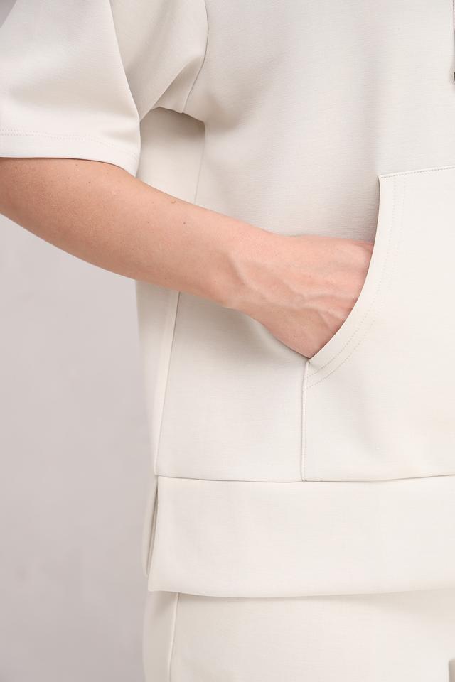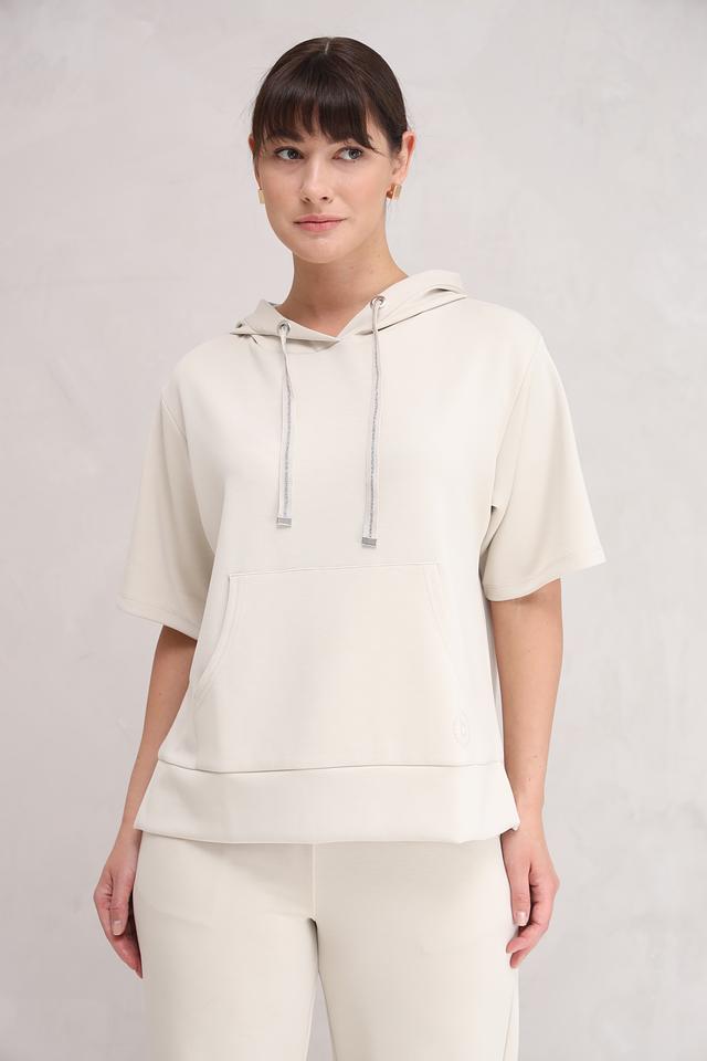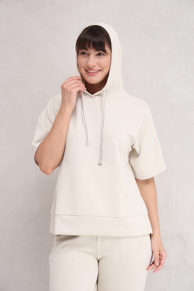 Бежевый пуловер Bugatti с короткими рукавами и капюшоном на шнурках – стильное и комфортное решение для повседневного образа. Модель выполнена из мягкого и приятного к телу трикотажа, обеспечивающего удобную посадку. Состав: модал 65%, полиэстер 30%, эластан 5%