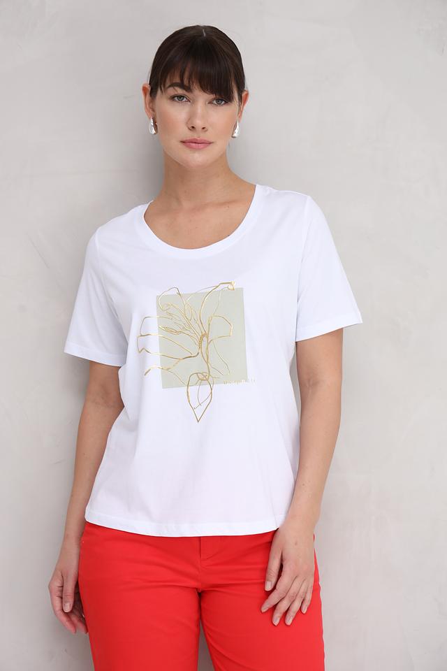 Особенностью данной модели является стильный цветочный принт, выполненный в нежных оттенках зелёного и золотистого. Принт придает футболке изысканность и оригинальность, позволяя создавать интересные и запоминающиеся образы.