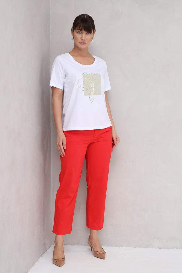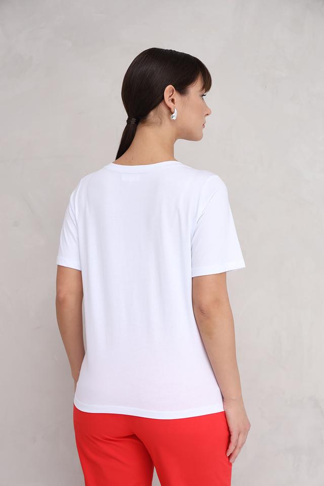 Футболка имеет классический прямой крой, который подходит для любой фигуры. Круглый вырез горловины и короткие рукава обеспечивают свободу движений. Эта футболка идеально сочетается с джинсами, брюками или юбками, создавая непринужденный и стильный образ.
