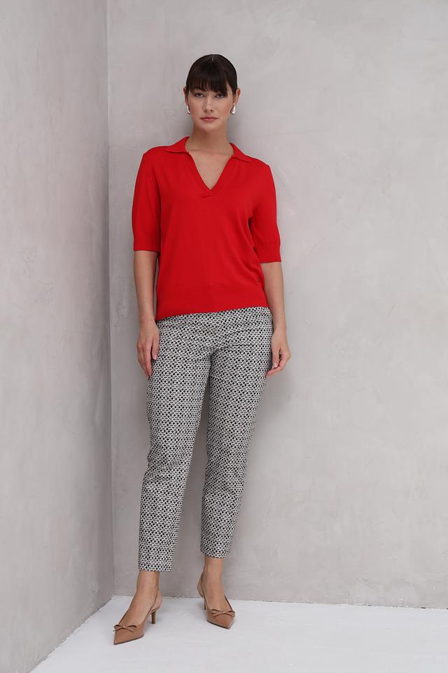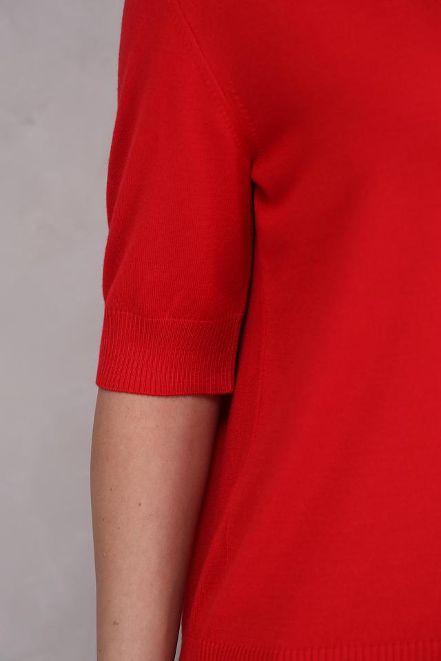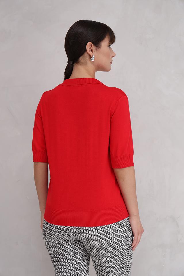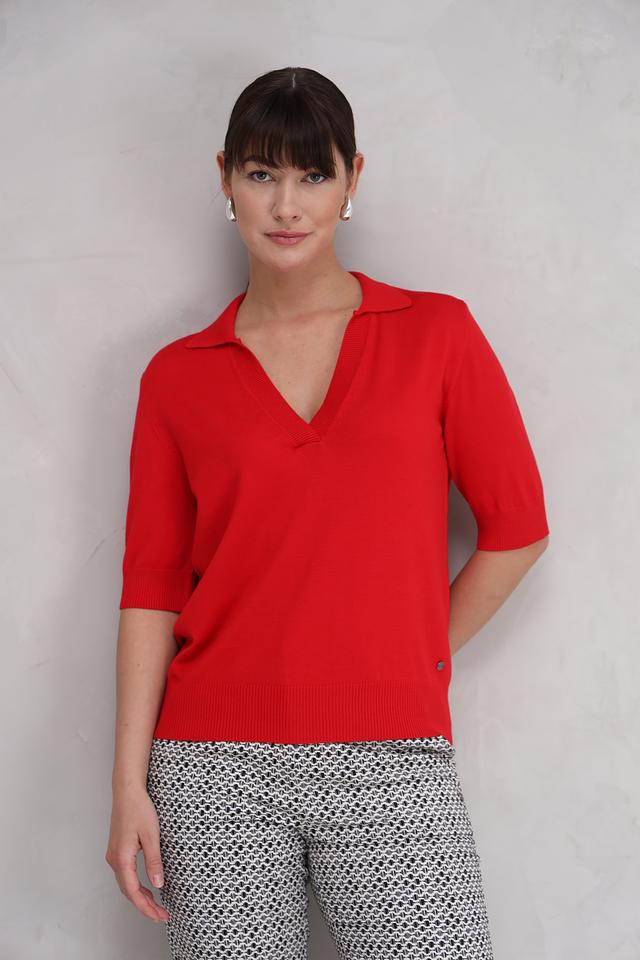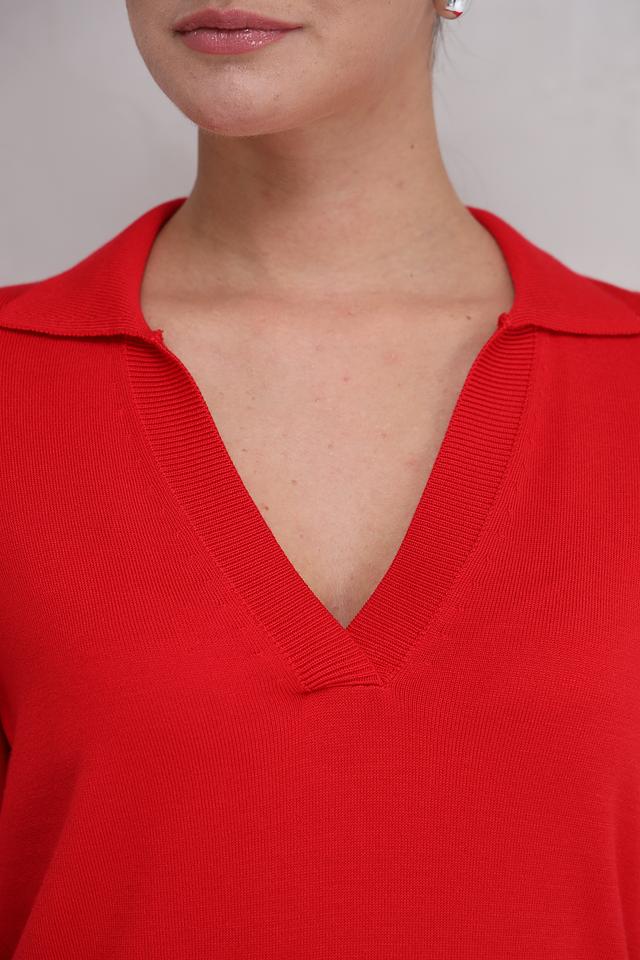 Яркий красный цвет пуловера привлекает внимание и придает образу выразительность. V-образный вырез, оформленный воротником-поло, добавляет модели оригинальности и элегантности. Короткие рукава делают этот пуловер идеальным выбором для теплой погоды.