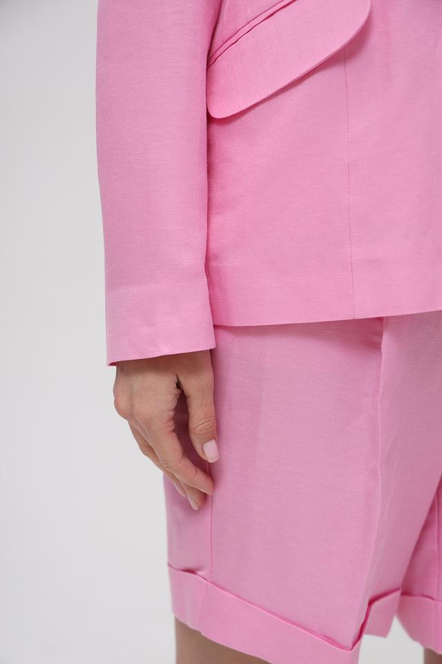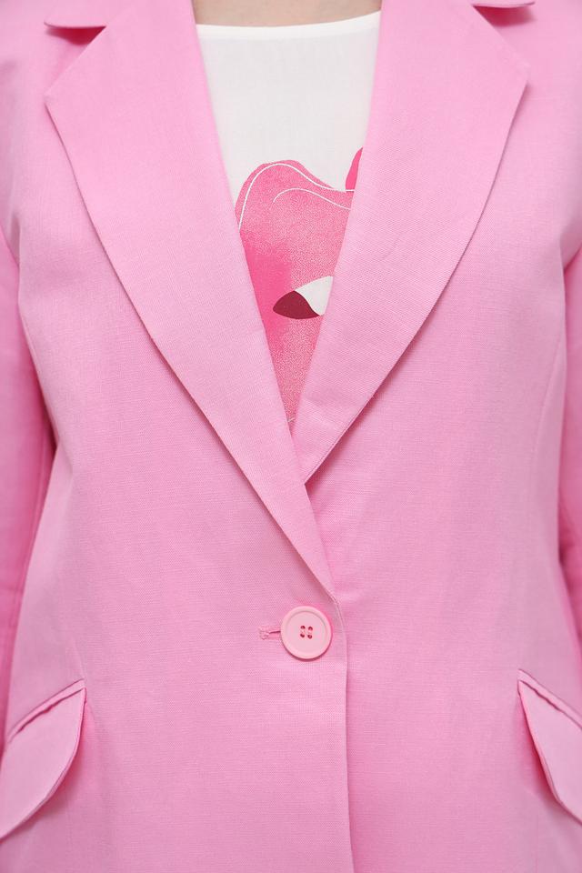 Жакет имеет классический прямой крой, лацканы и застёжку на одну пуговицу. Длинные рукава и два функциональных кармана добавляют практичности. Нежный розовый цвет делает этот жакет ярким акцентом в гардеробе.