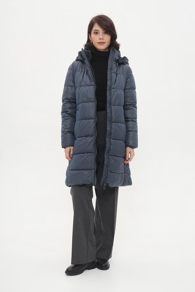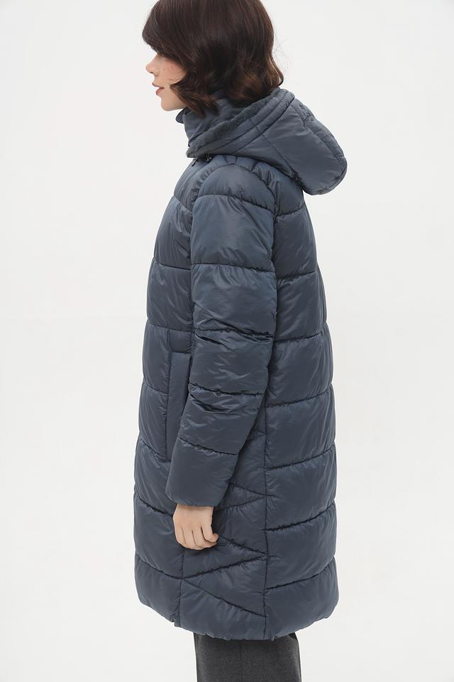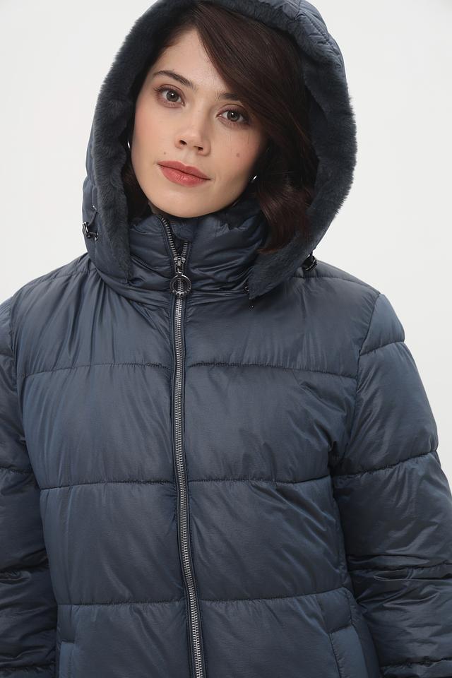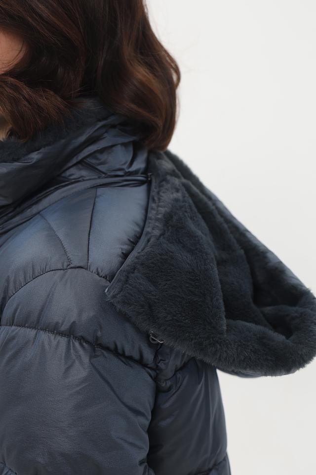 Модель оснащена капюшоном, отделанным искусственным мехом, что обеспечивает дополнительную защиту от холода и ветра. Застежка – молния по всей длине изделия. Пальто имеет два боковых кармана.