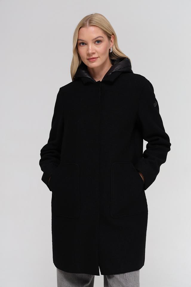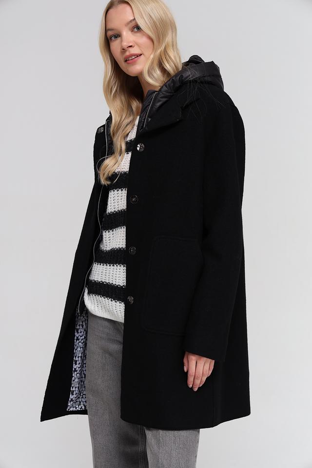 Чёрное пальто Bugatti с капюшоном и застёжкой на пуговицы – элегантное и практичное решение для прохладной погоды. Изготовлено из 100% шерсти, обеспечивающей тепло и комфорт. Состав: шерсть 100%