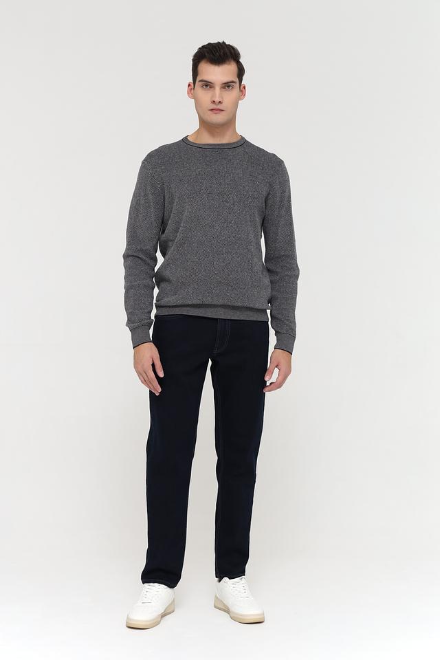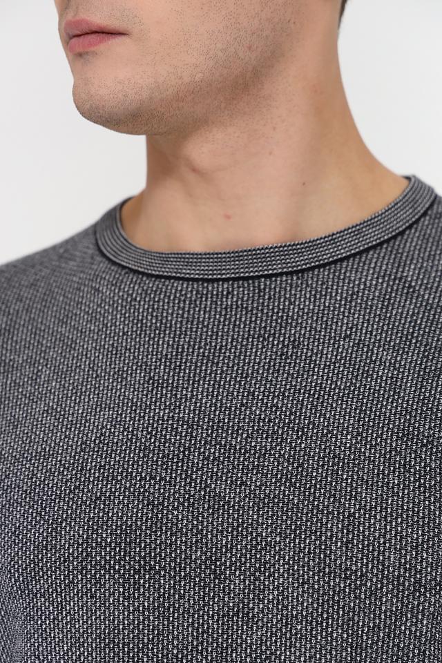 Джемпер имеет классический крой с круглым вырезом горловины и длинными рукавами. Рифлёная отделка на горловине, манжетах и нижней части изделия добавляет аккуратности и подчеркивает стиль. Текстура ткани создает интересный визуальный эффект.