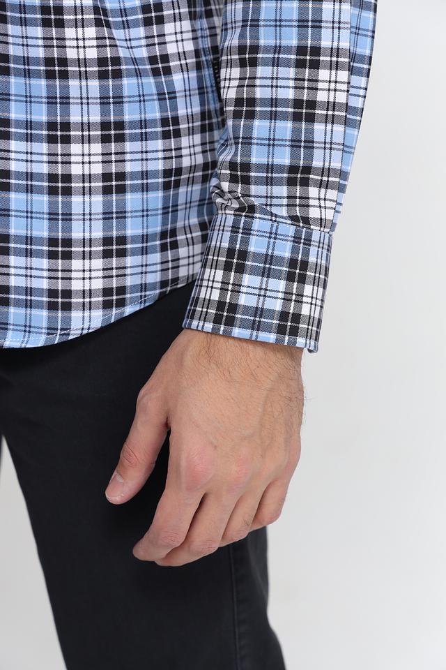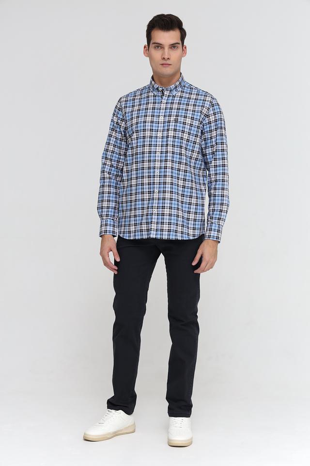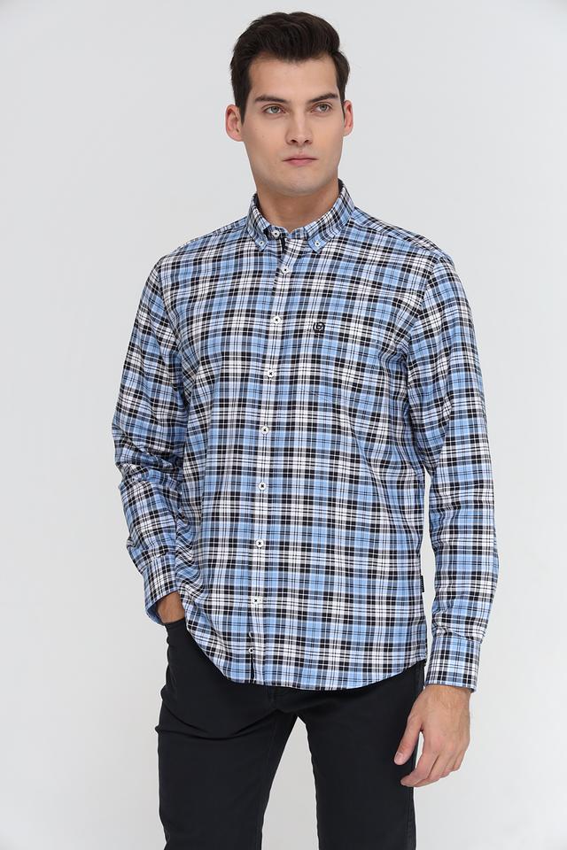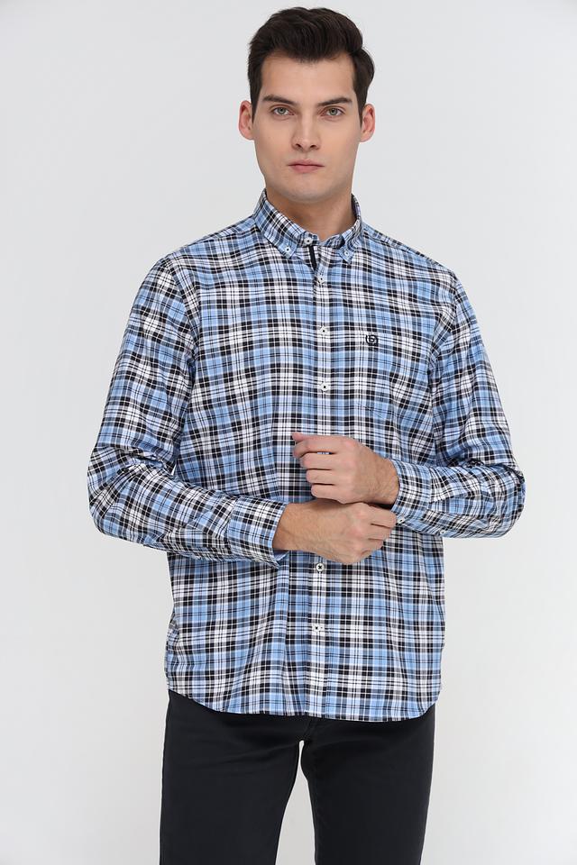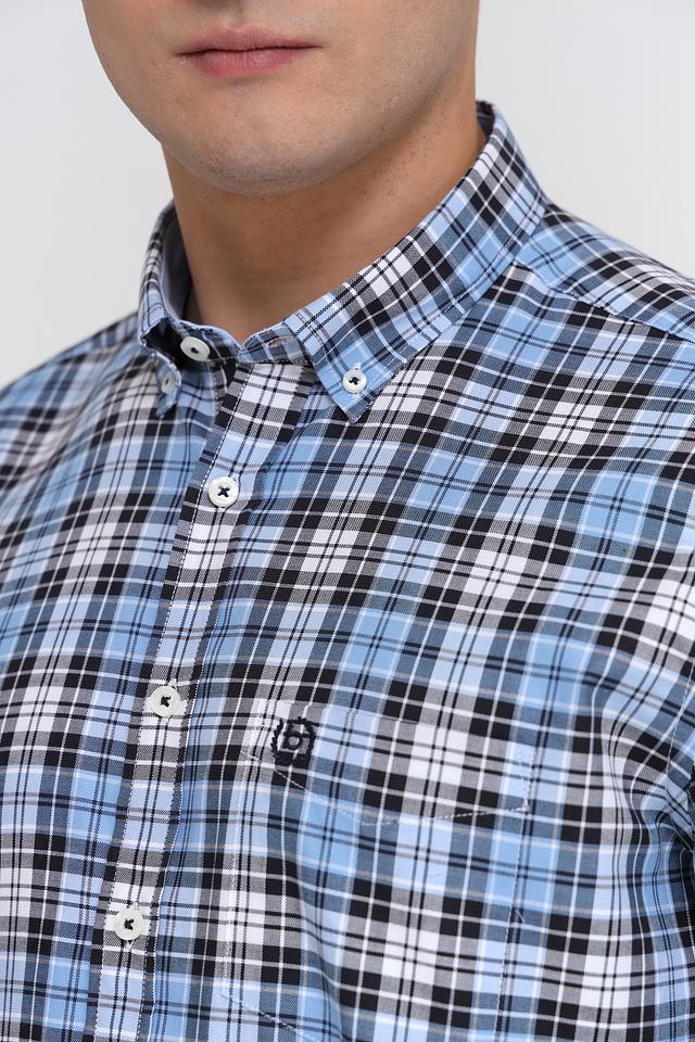 Рубашка выполнена в классическом крое с длинными рукавами и традиционным воротником. Особенностью модели является клетчатый рисунок, сочетающий в себе голубые, белые и черные оттенки. На груди расположена небольшая эмблема бренда Bugatti.