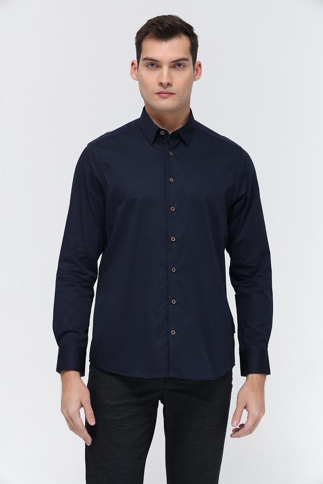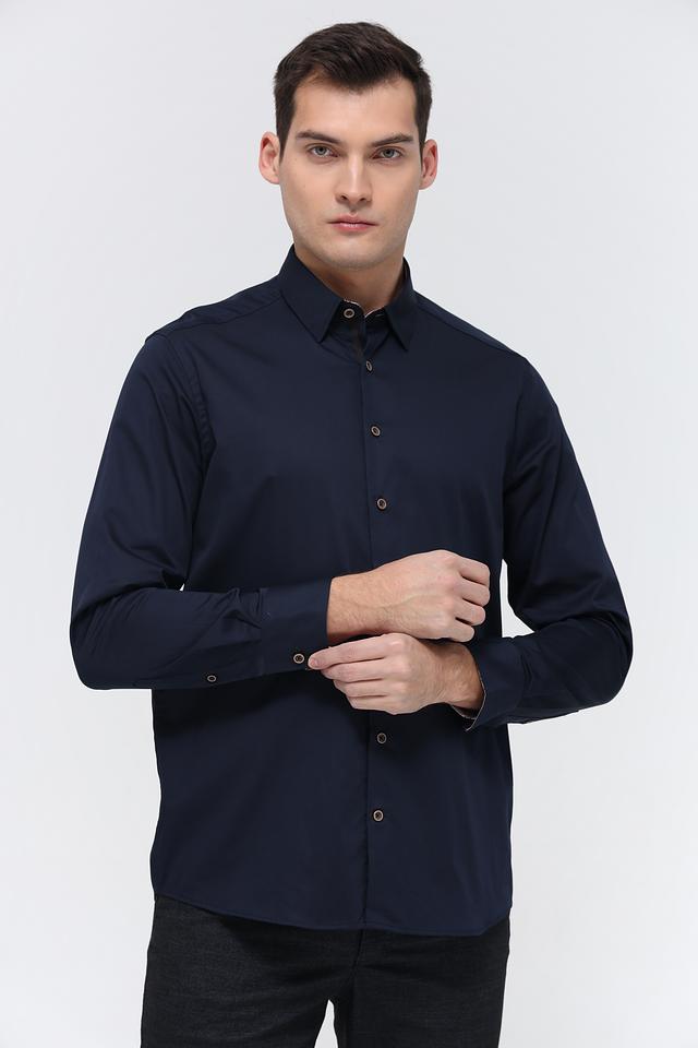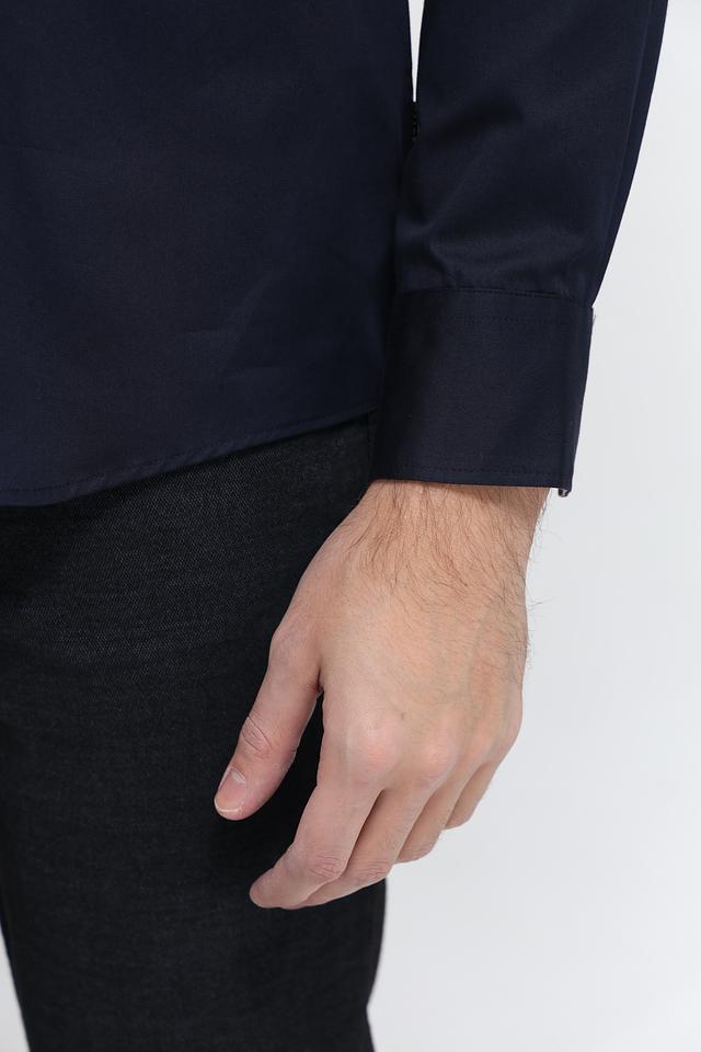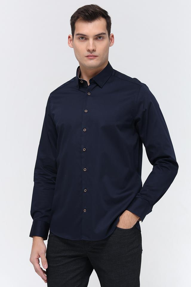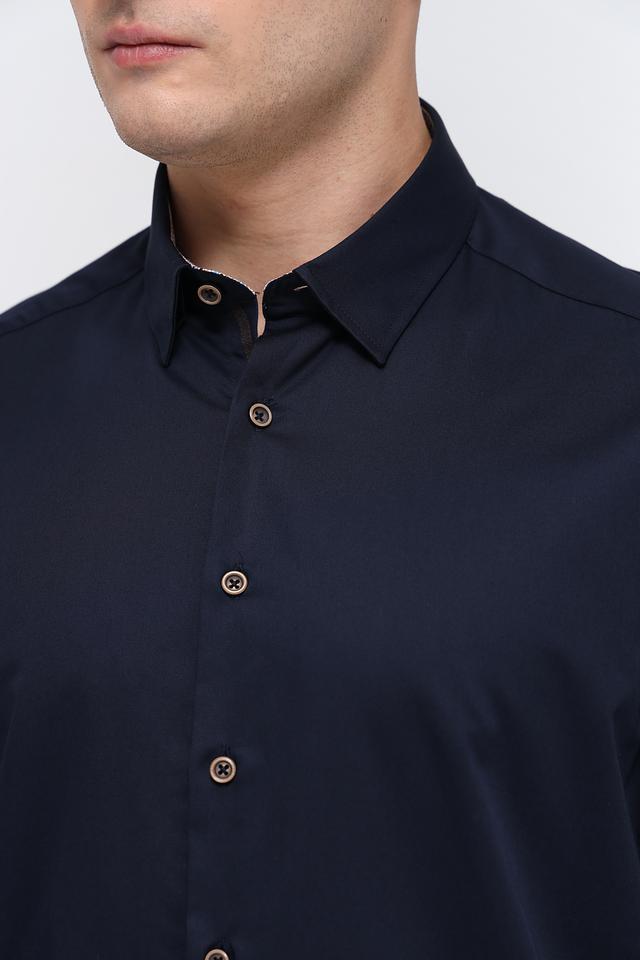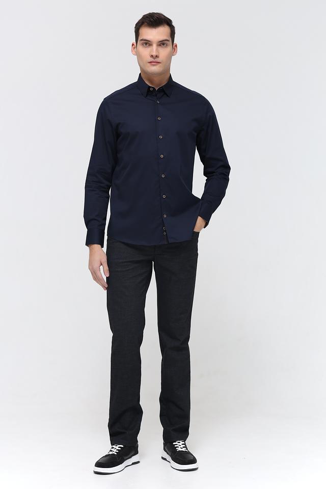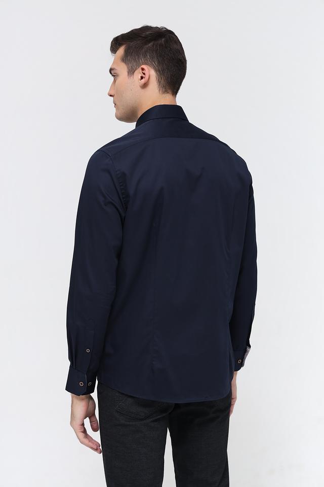 Воротник рубашки классической формы, что придает ей элегантный вид. Застежка на пуговицах выполнена в тон рубашки, что создает целостный образ. Тёмно-синий цвет рубашки универсален и легко сочетается с различными элементами гардероба.