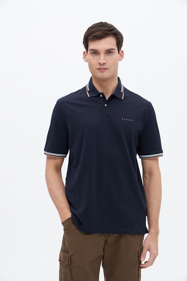 Мужское поло Bugatti темно-синего цвета с контрастной полоской на воротнике и рукавах. Изготовлено из комфортного сочетания хлопка, полиэстера и эластана, обеспечивающего удобную посадку и практичность. Состав: хлопок 52%, полиэстер 44%, эластан 4%