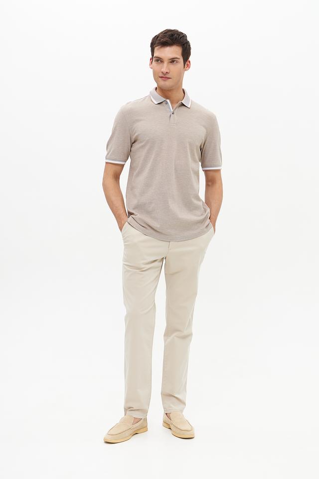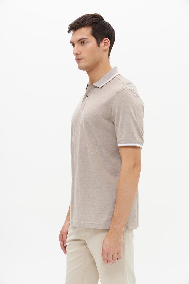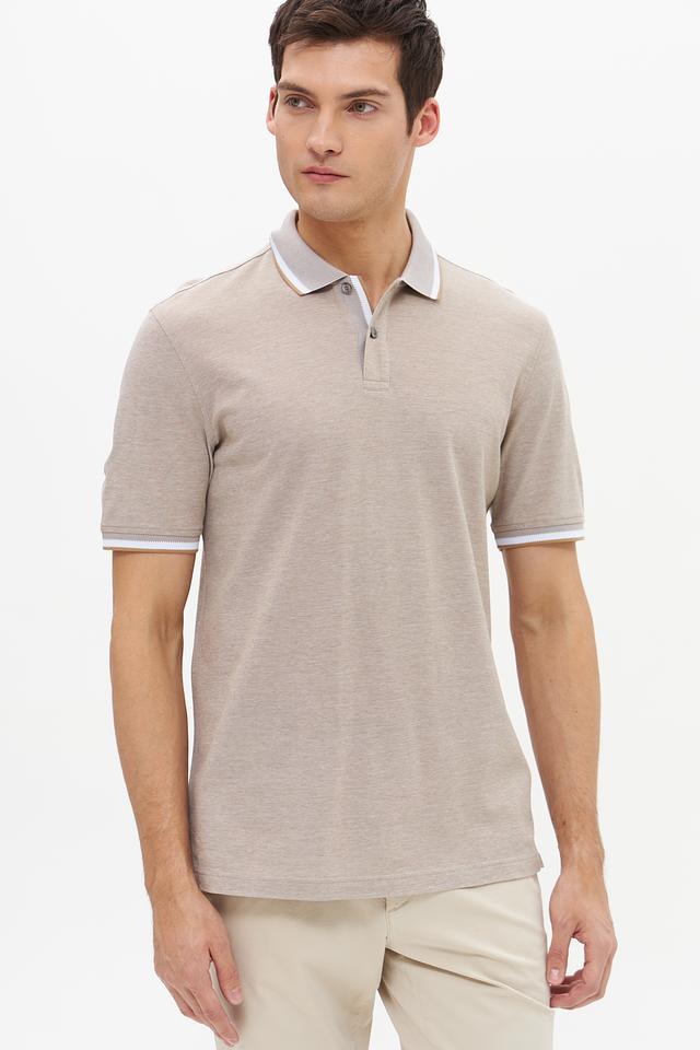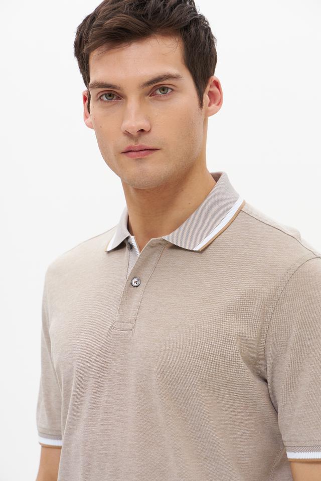 Модель имеет классический крой, подходящий для различных типов фигуры. Бежевый цвет поло дополнен контрастной отделкой на воротнике и коротких рукавах, что придает изделию стильный и современный вид.