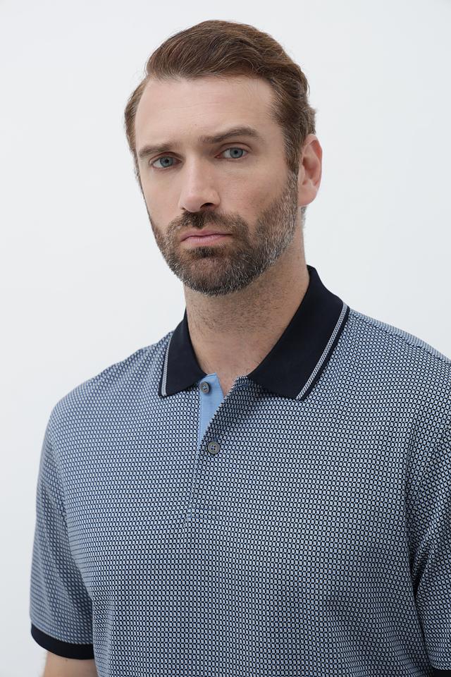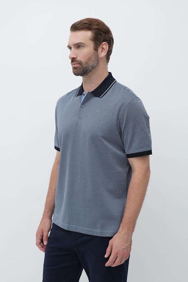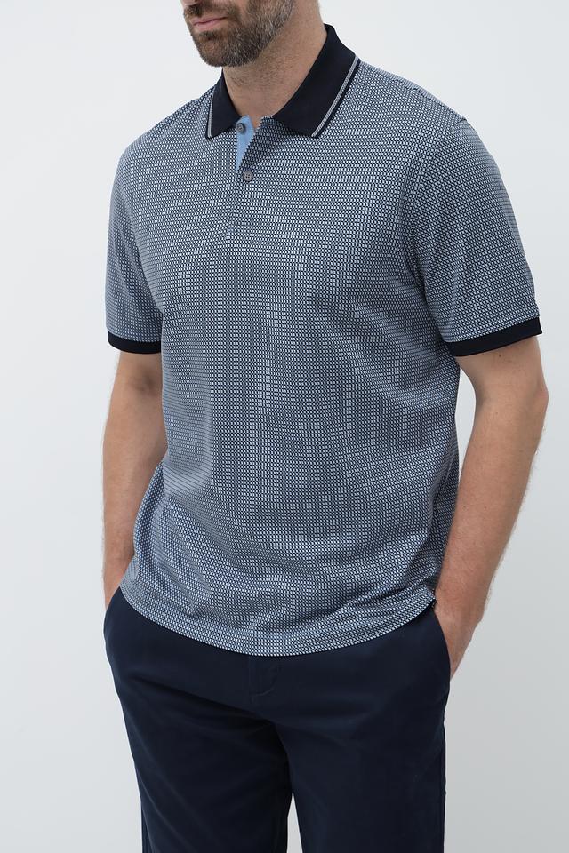 Мужское поло Bugatti синего цвета с геометрическим принтом. Изготовлено из 100% хлопка, имеет короткий рукав и классический крой. Отличный выбор для создания стильного и комфортного образа. Состав: хлопок 100%