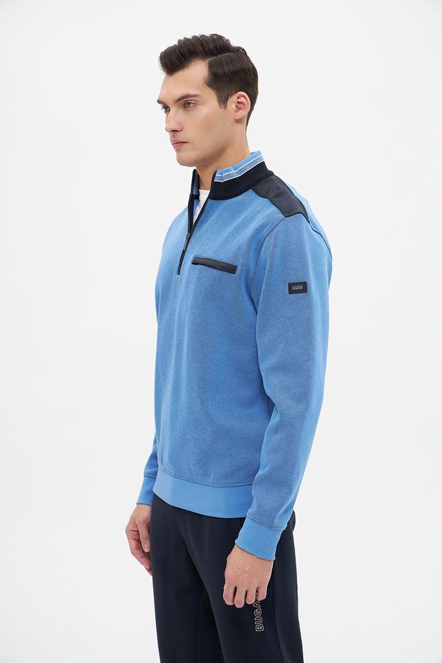 Голубой джемпер Bugatti с короткой молнией и контрастной отделкой. Изготовлен из мягкого хлопка с добавлением полиэстера для комфорта и долговечности. Стильный и удобный выбор для повседневного гардероба. Состав: хлопок 90%, полиэстер 10%