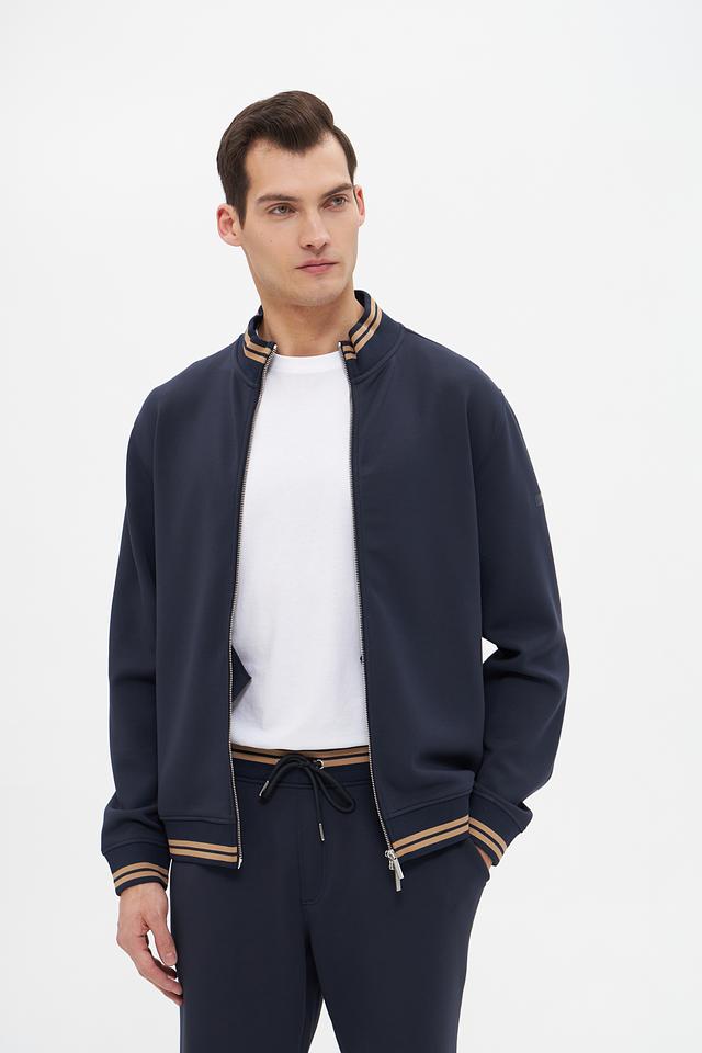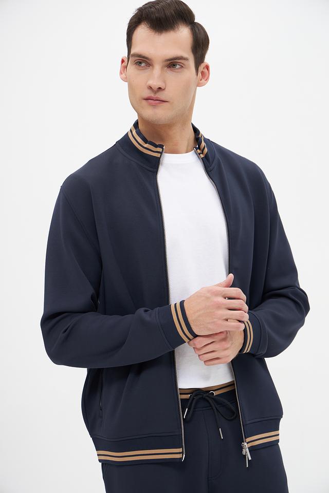 Модель имеет удобную застёжку-молнию, воротник-стойку и манжеты с тонкой полоской в бежево-золотистом цвете, что придает ей особый шарм. Кардиган выполнен из высококачественного модала, полиэстера и эластана, обеспечивающих мягкость, комфорт и хорошую посадку по фигуре.