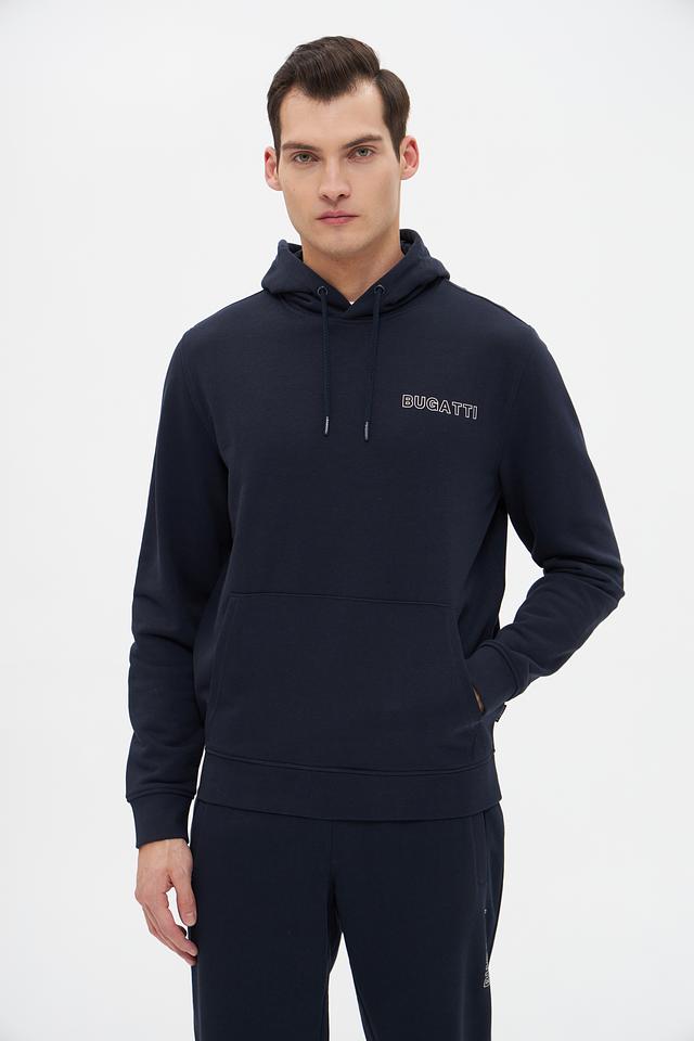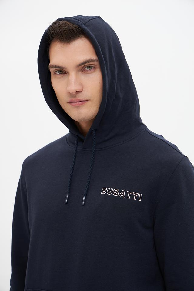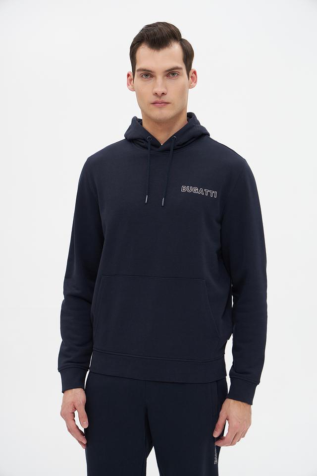 Мужское худи Bugatti тёмно-синего цвета с логотипом бренда на груди. Модель выполнена из мягкого хлопка с добавлением полиэстера для комфорта и долговечности. Идеальный выбор для повседневного образа. Состав: хлопок 87%, полиэстер 13%