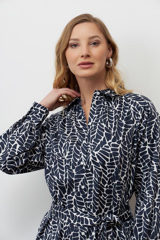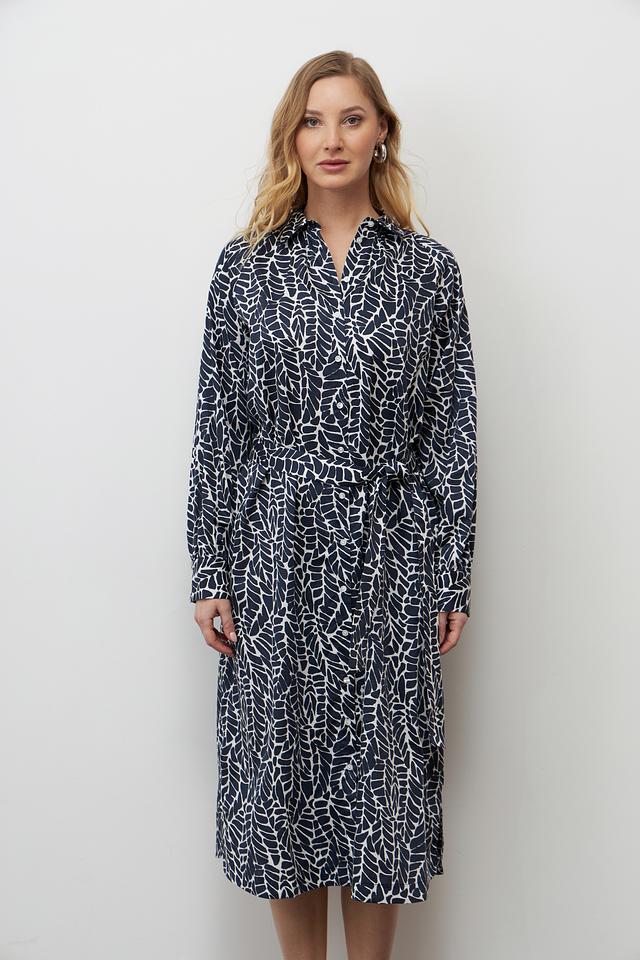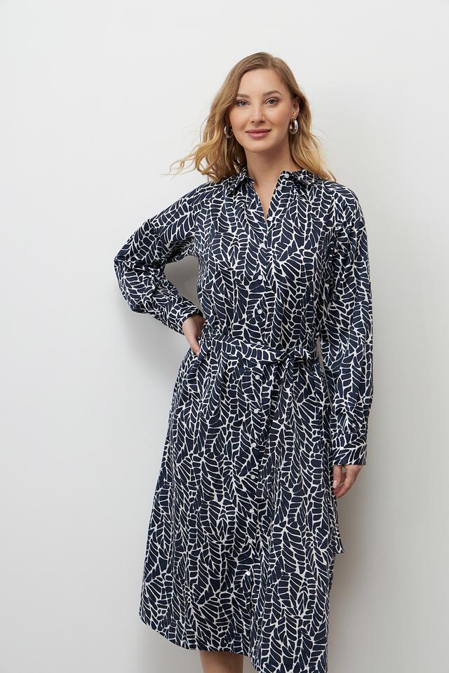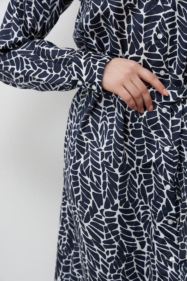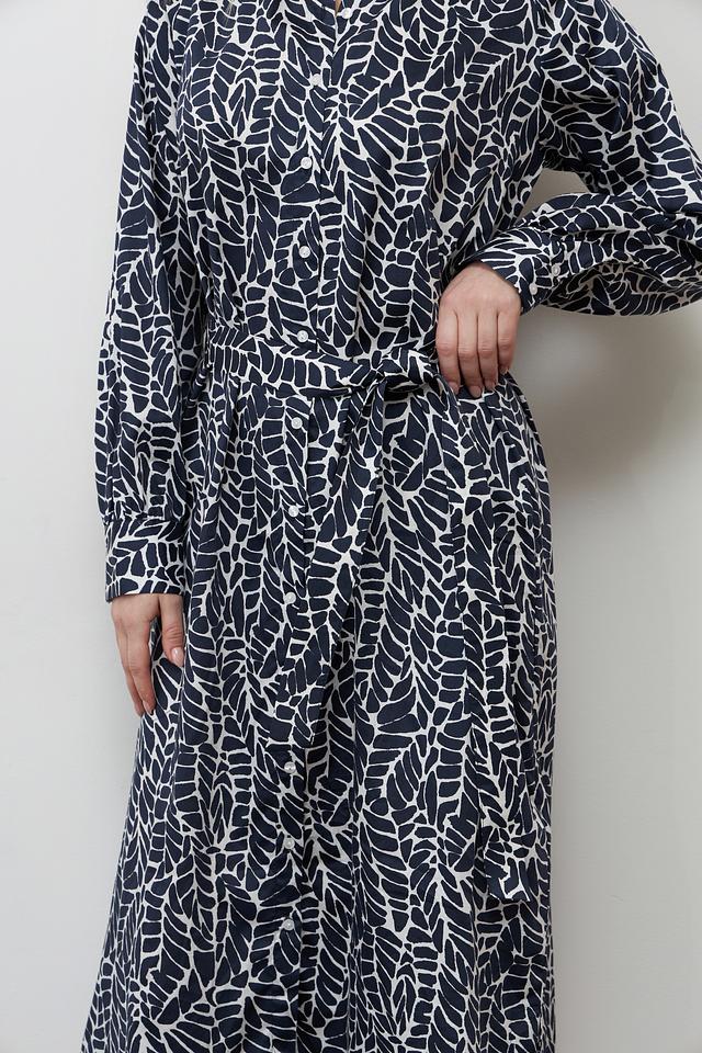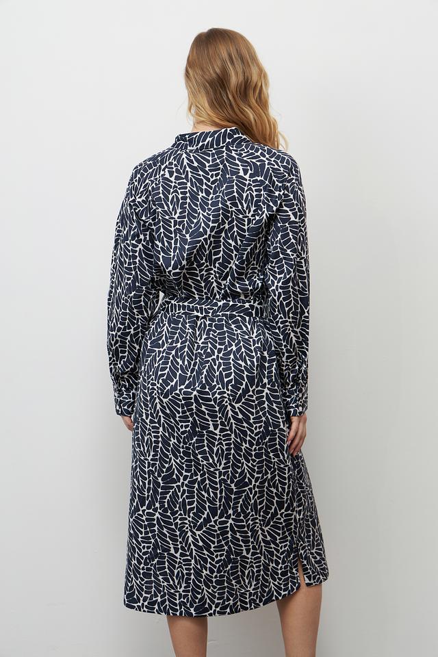 Платье Bugatti синего цвета с оригинальным принтом в виде листьев – стильное и комфортное решение для повседневного образа. Модель выполнена из 100% хлопка, имеет рубашечный крой и пояс. Состав: хлопок 100%