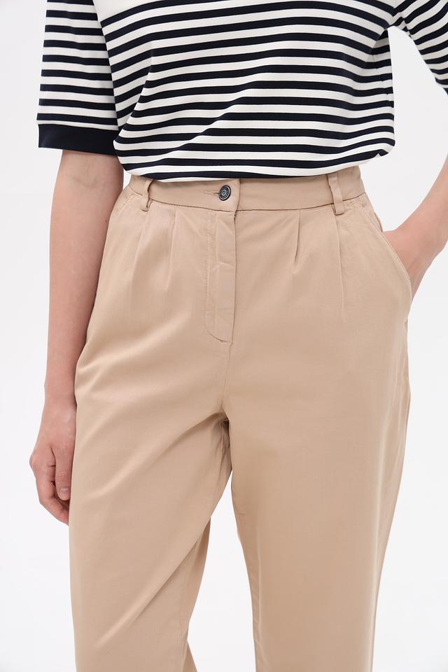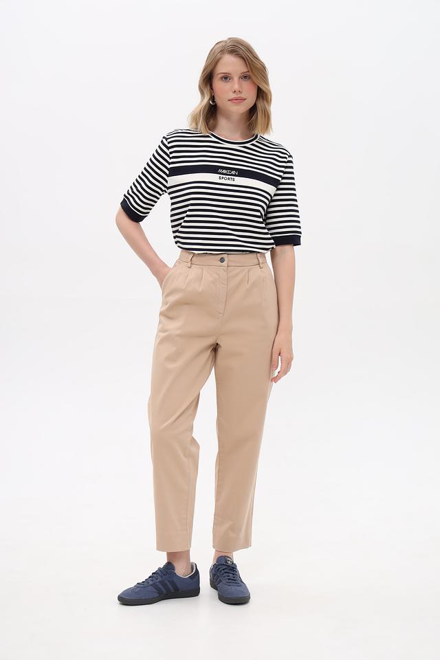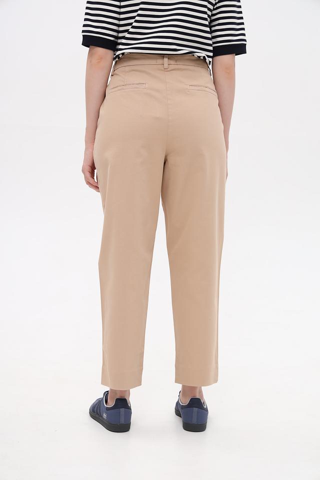 Брюки имеют прямой крой, пояс на пуговицу и аккуратные складки спереди, что придает им элегантный вид. Изготовлены из высококачественного хлопка с добавлением эластана, обеспечивающего комфорт при носке и сохранение формы.
