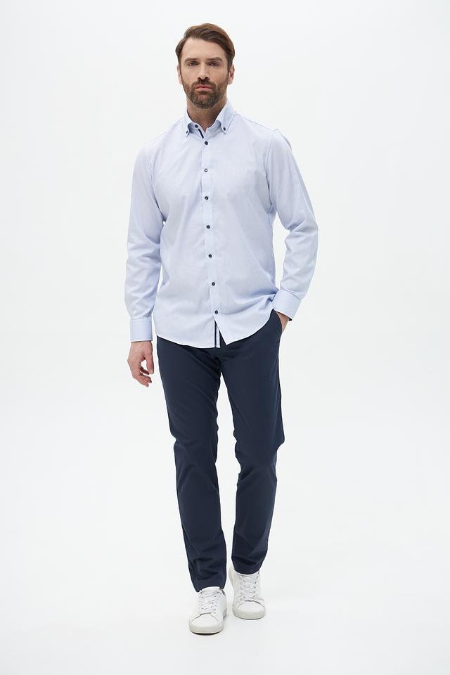 Брюки выполнены из высококачественного хлопка с добавлением эластана, что придает им мягкость, комфорт и небольшую эластичность. Ткань приятна на ощупь и хорошо держит форму. Цвет брюк – насыщенный темно-синий, который легко сочетается с различными элементами гардероба.