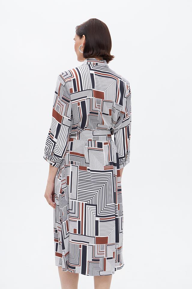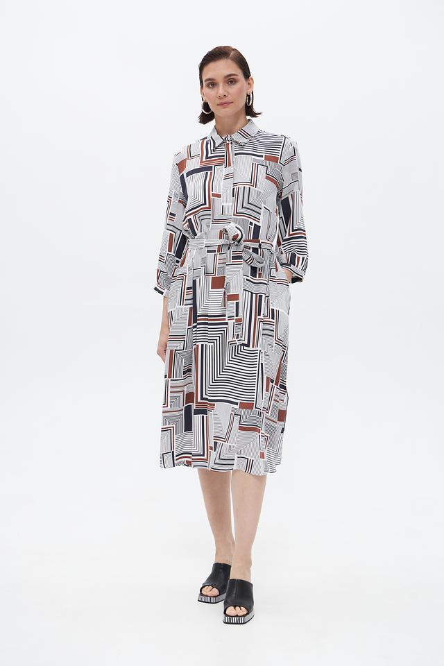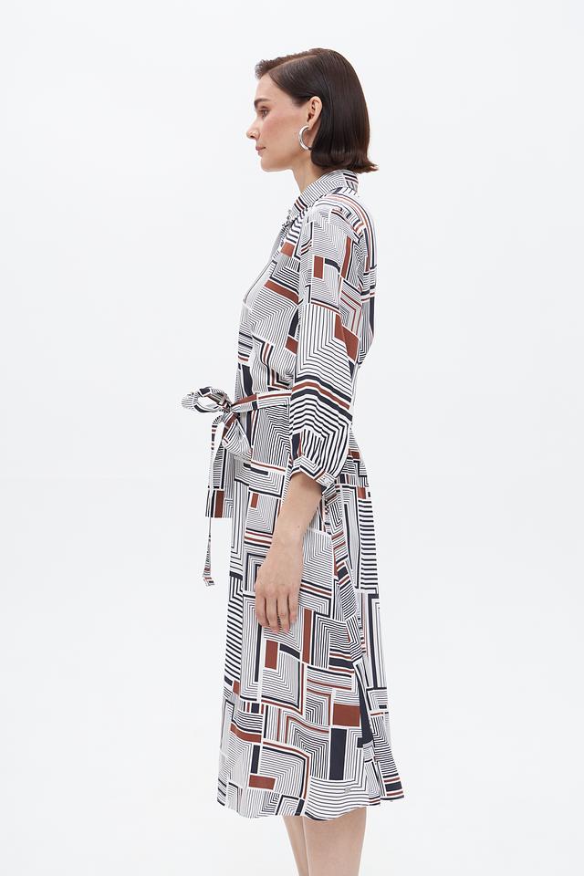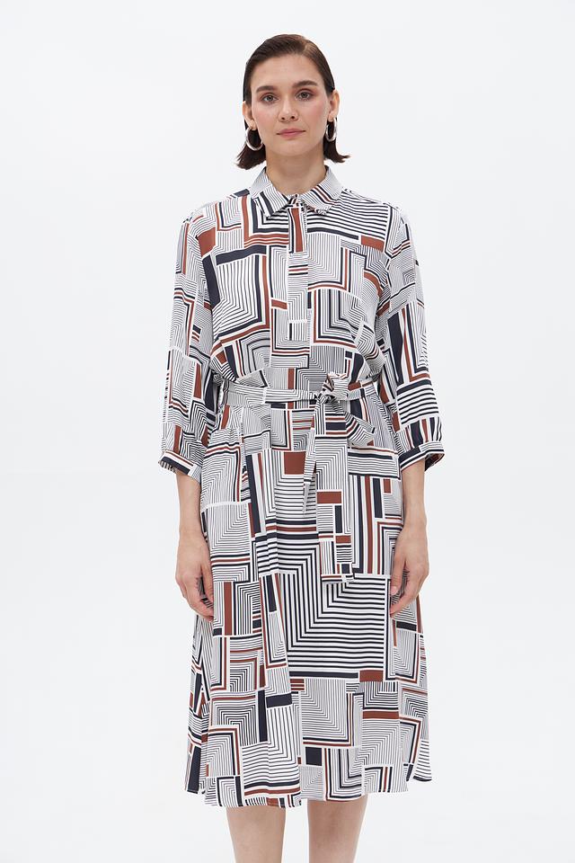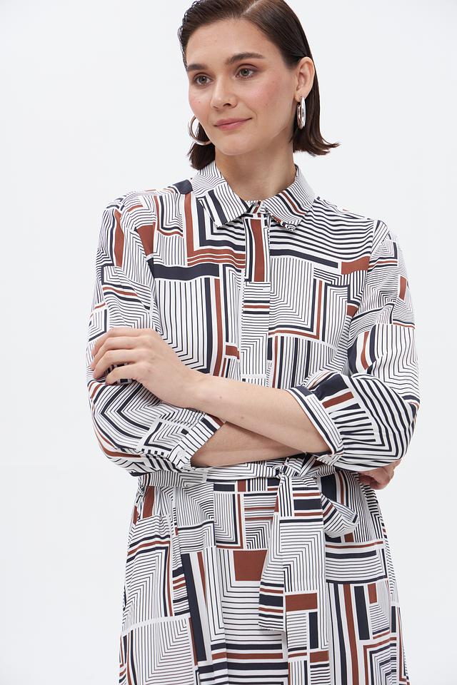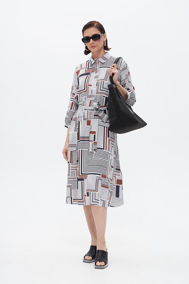 Элегантное платье от бренда Bugatti станет прекрасным дополнением к вашему гардеробу. Платье выполнено в белом цвете и украшено выразительным геометрическим принтом, сочетающим в себе чёрные и коричневые оттенки.