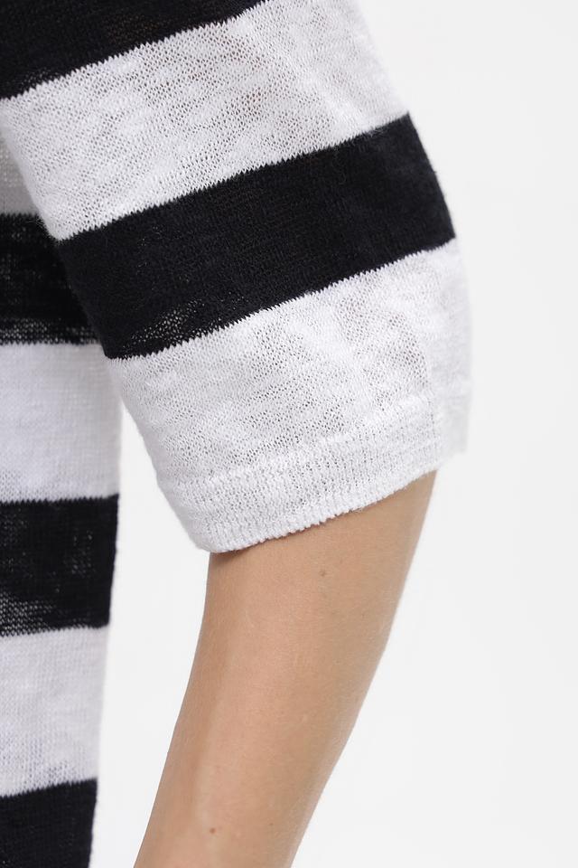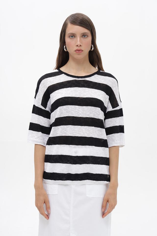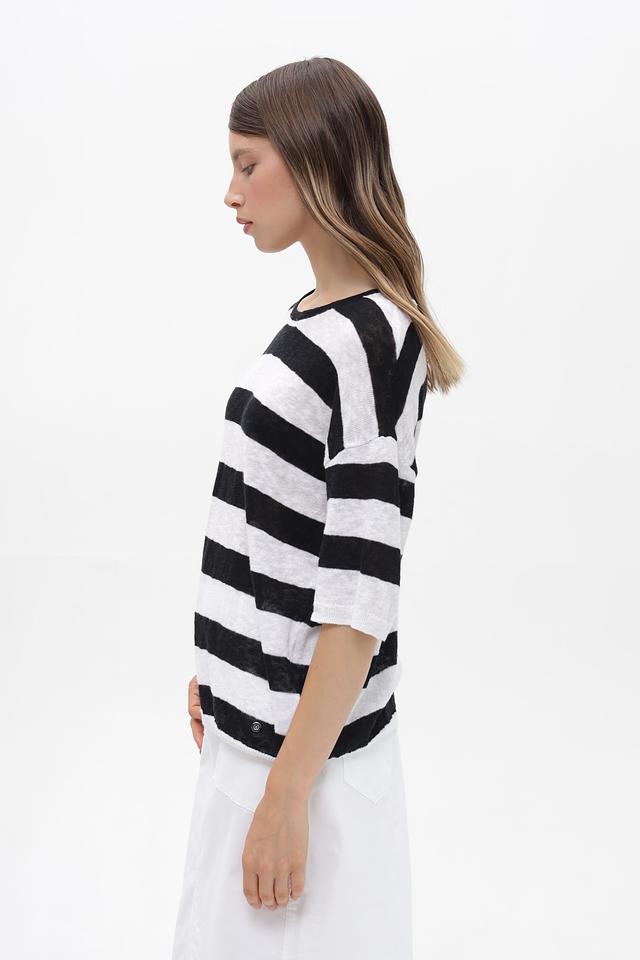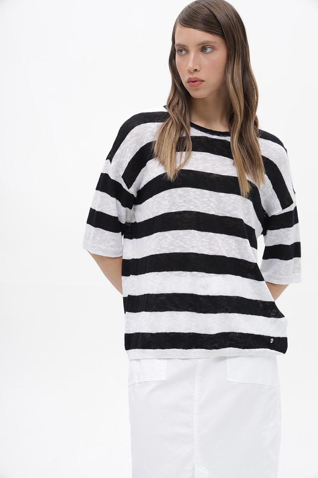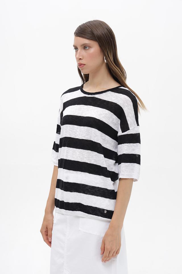 Женский пуловер Bugatti чёрно-белого цвета с коротким рукавом и полосатым узором. Изготовлен из натурального хлопка с добавлением льна, что обеспечивает комфорт и воздухопроницаемость. Состав: хлопок 59%, лен 41%