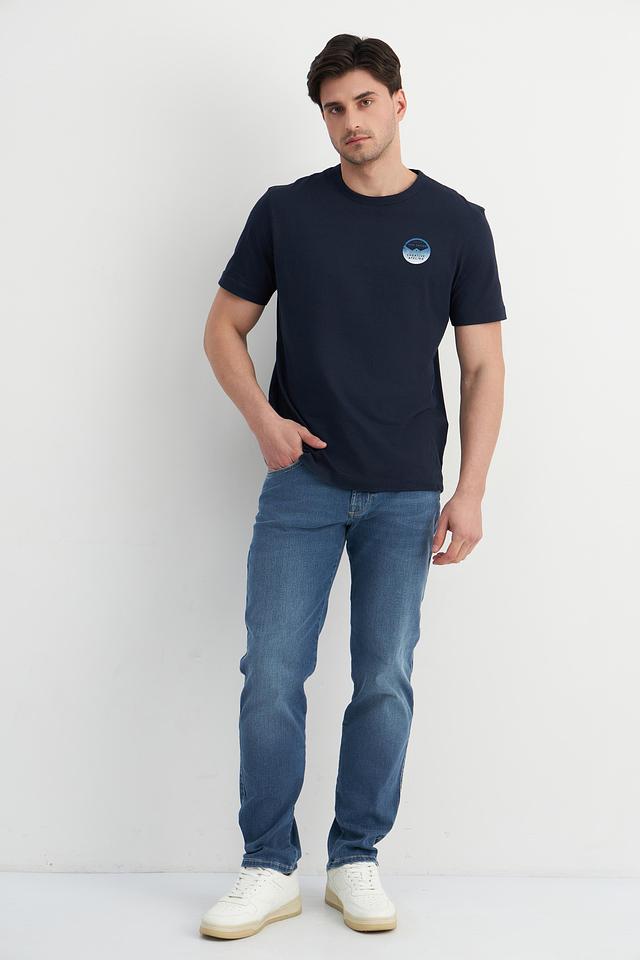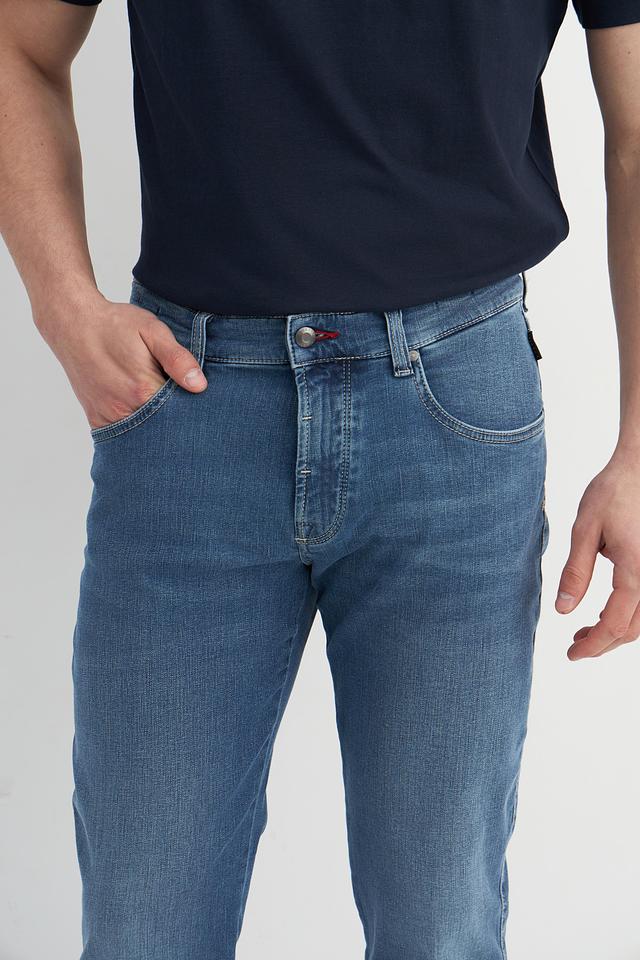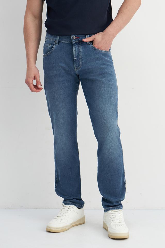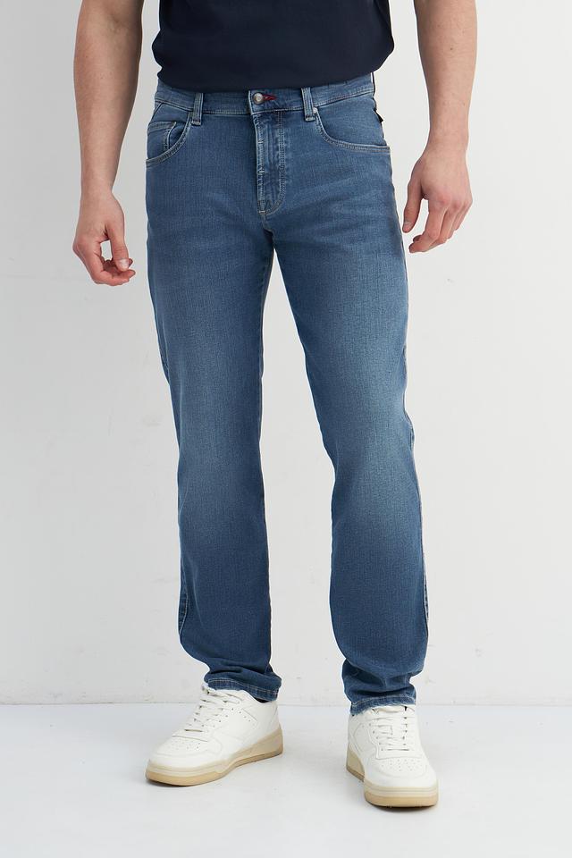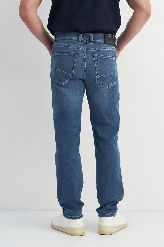 Мужские джинсы Bugatti синего цвета с декоративной красной вышивкой по швам. Классический крой и комфортный состав обеспечивают удобную посадку и долговечность. Состав: хлопок 92%, эластомультиэстер 6%, эластан 2%