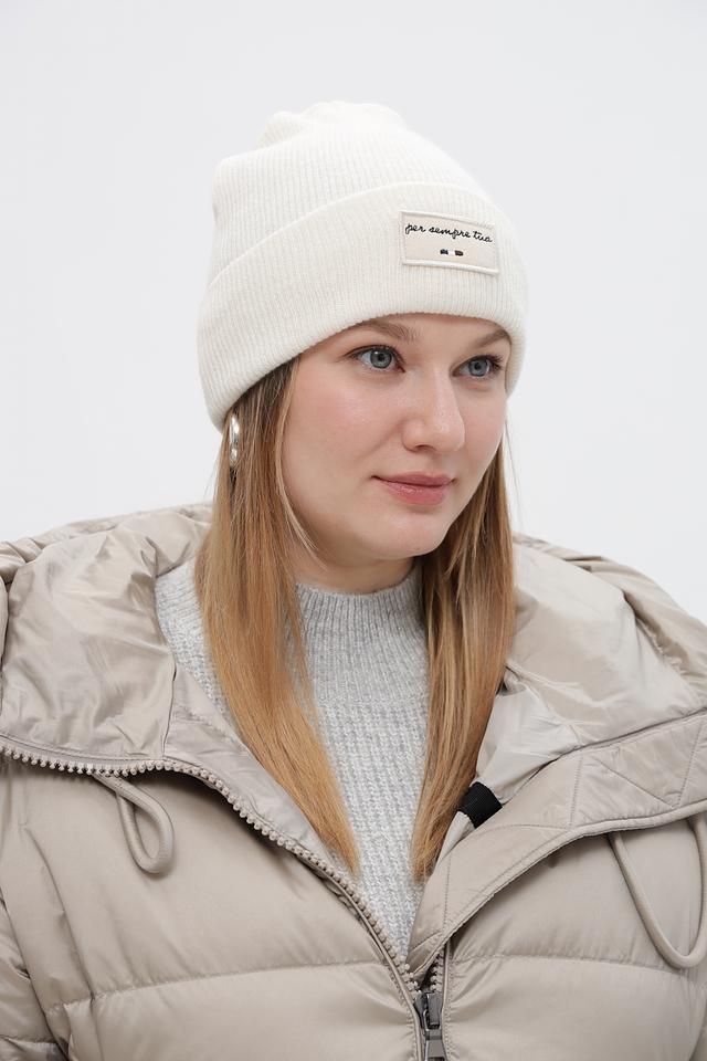 На передней части шапки расположена небольшая нашивка с логотипом бренда и надписью “per sempre tua”. Вязаная текстура шапки придает ей уютный и стильный вид. Благодаря своему составу, шапка мягкая и приятная к коже.