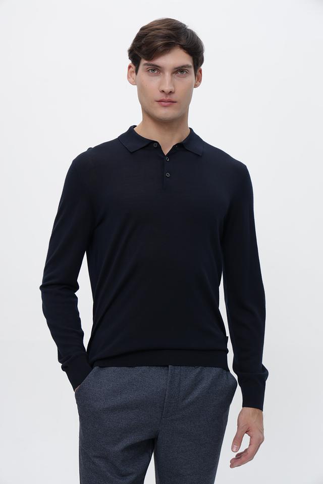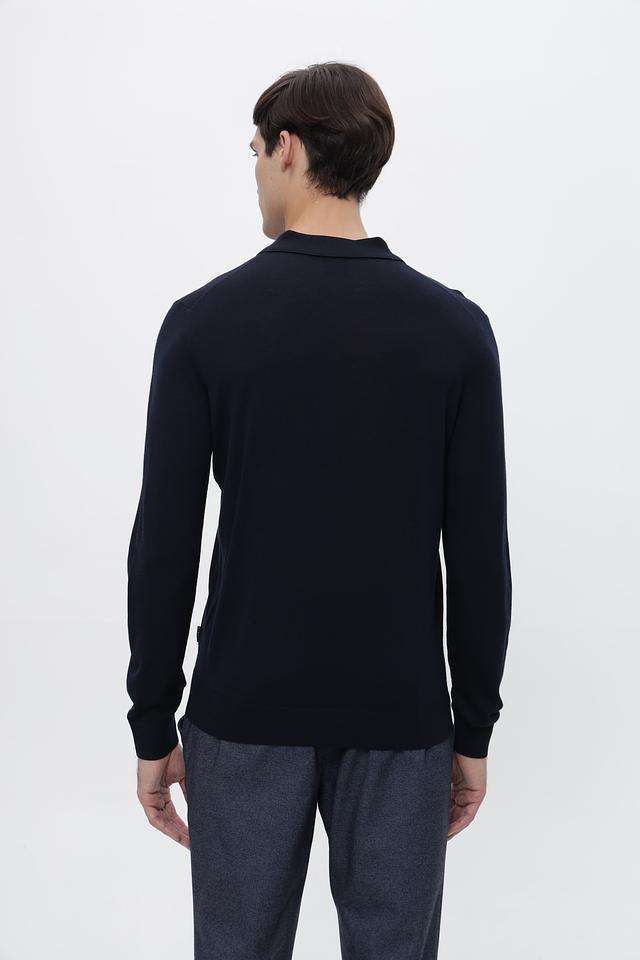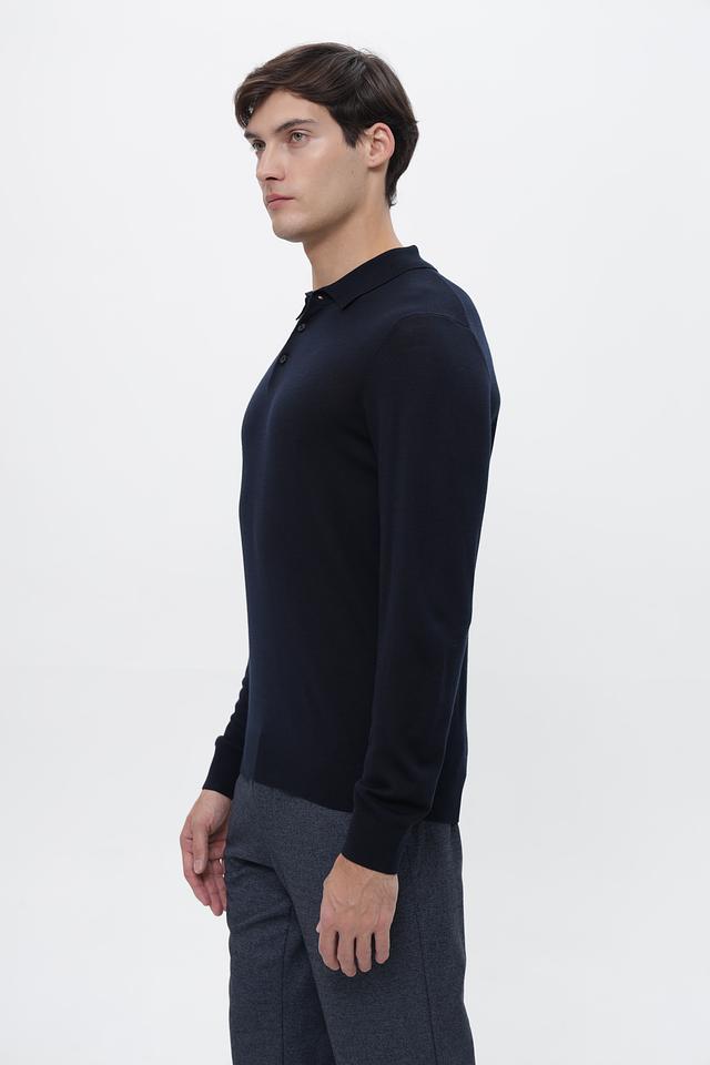 Джемпер имеет классический крой с длинными рукавами и воротником-поло с небольшой планкой, застегивающейся на пуговицы. Тёмно-синий цвет делает его универсальным элементом гардероба, который легко сочетается с различными брюками и обувью.