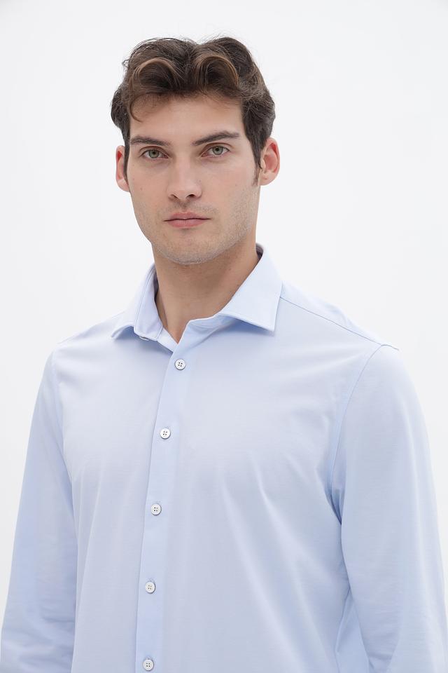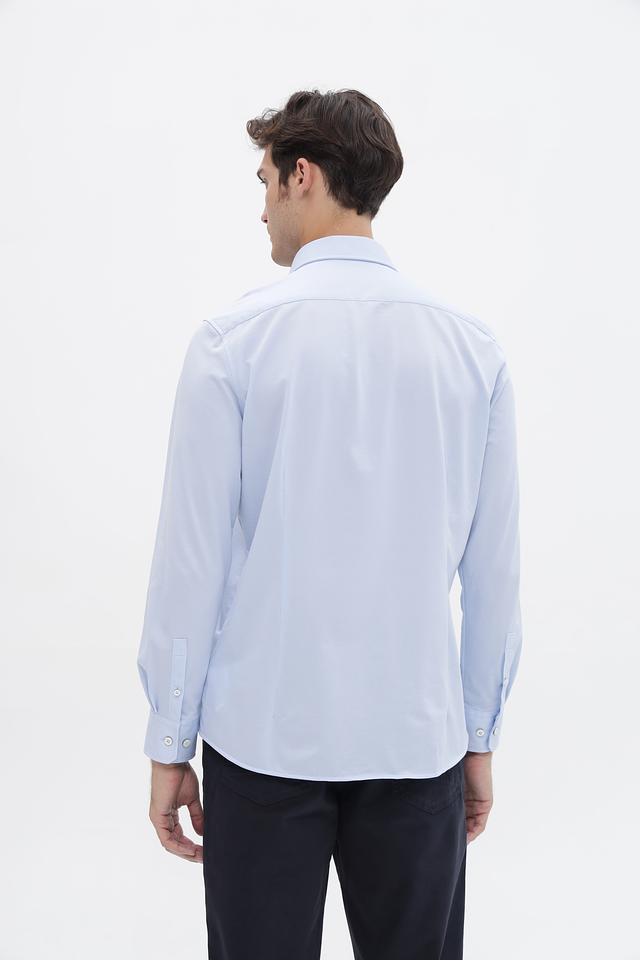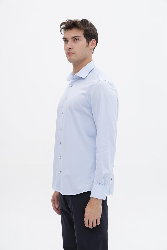 Рубашка имеет приталенный крой, который выгодно подчеркивает силуэт. Классический воротник и манжеты на пуговицах придают ей элегантный вид. Изготовлена из высококачественного хлопка с добавлением полиэстера, что обеспечивает комфорт, износостойкость и простоту в уходе.