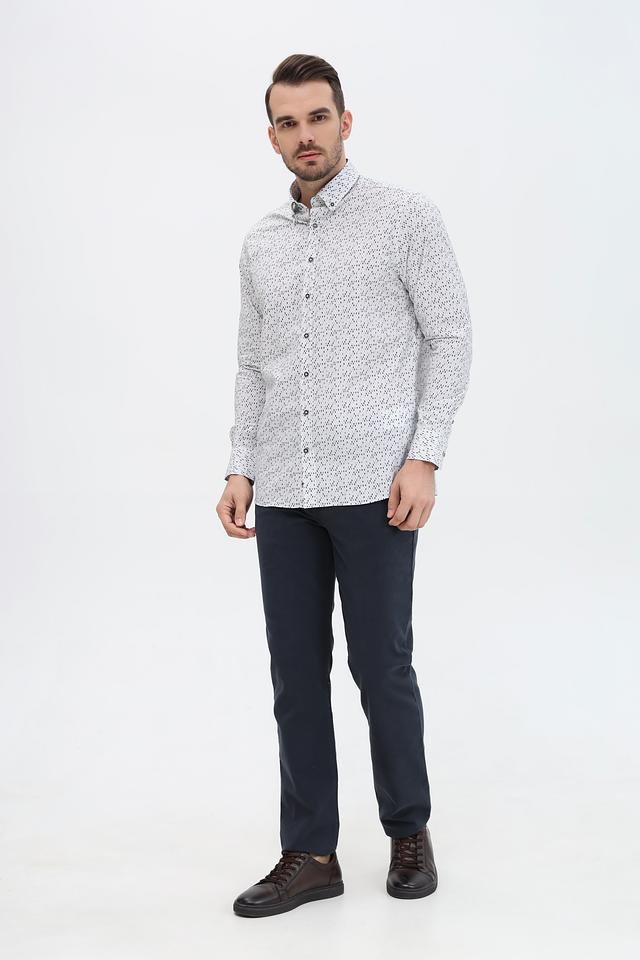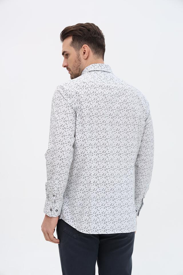 Рубашка имеет классический крой с длинными рукавами, манжетами на пуговицах и воротником на пуговицах. Особенностью модели является стильный принт, состоящий из мелких геометрических фигур в сине-черной гамме на белом фоне.