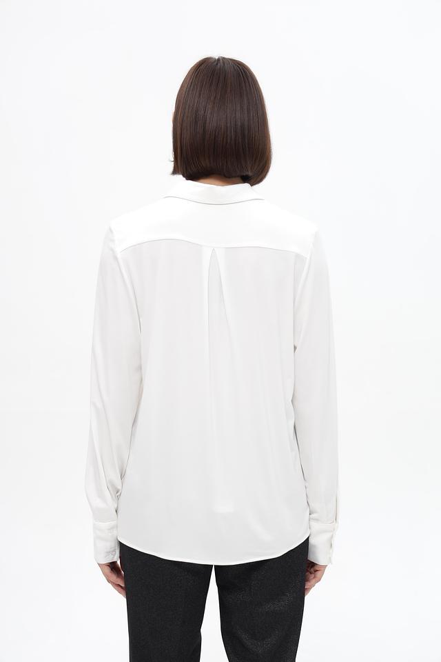 Блузка дополнена воротником классической формы и застежкой на пуговицы по всей длине. Длинные рукава заканчиваются манжетами на пуговицах, что позволяет регулировать их длину и создавать различные образы.