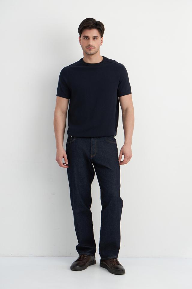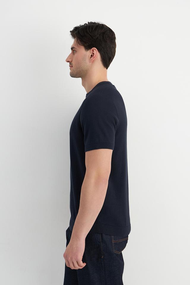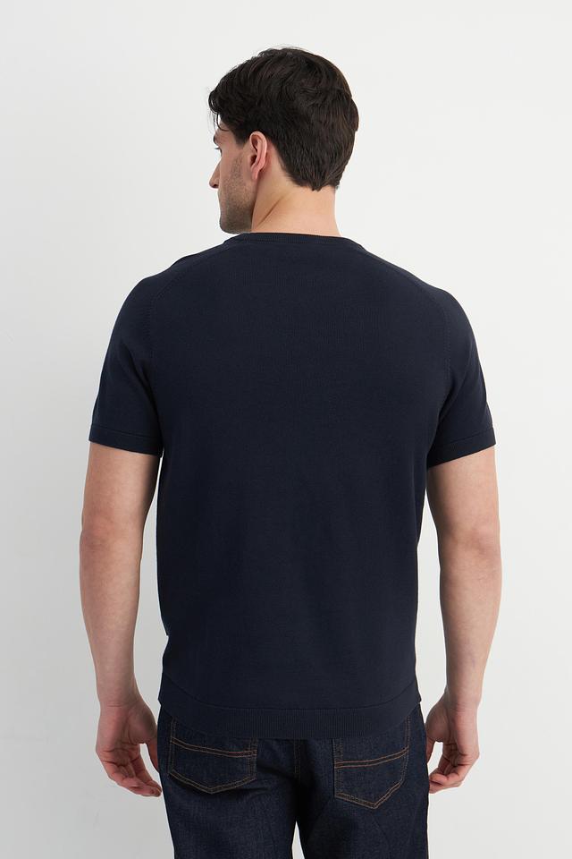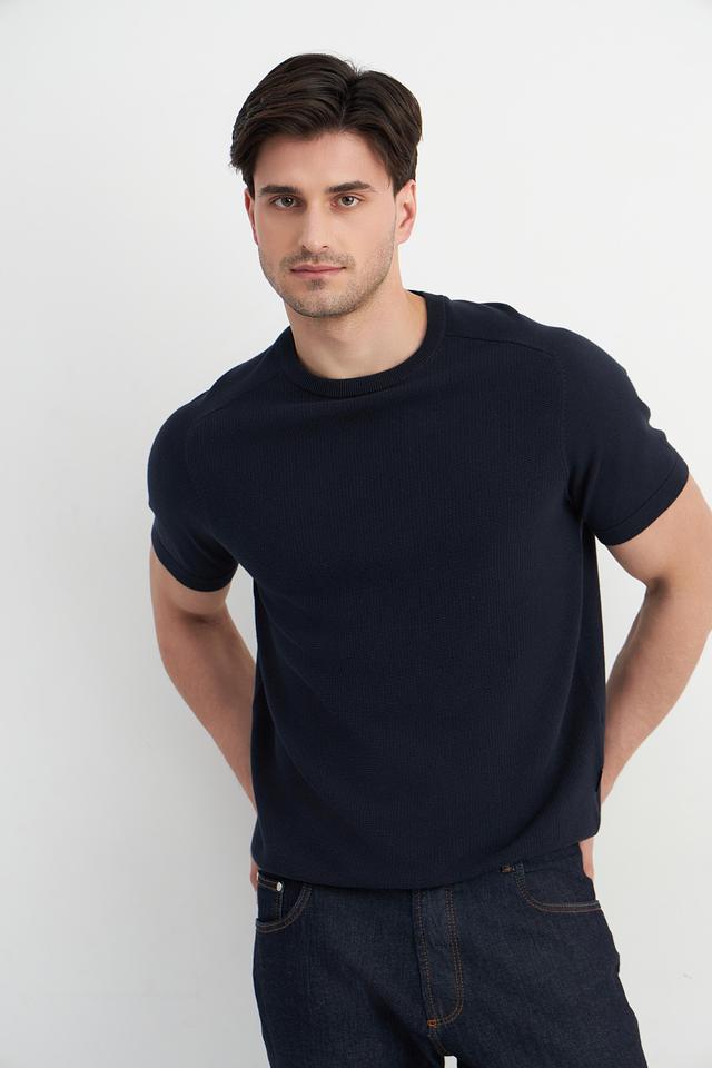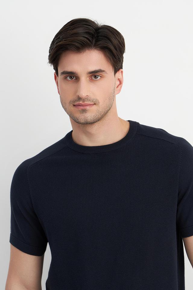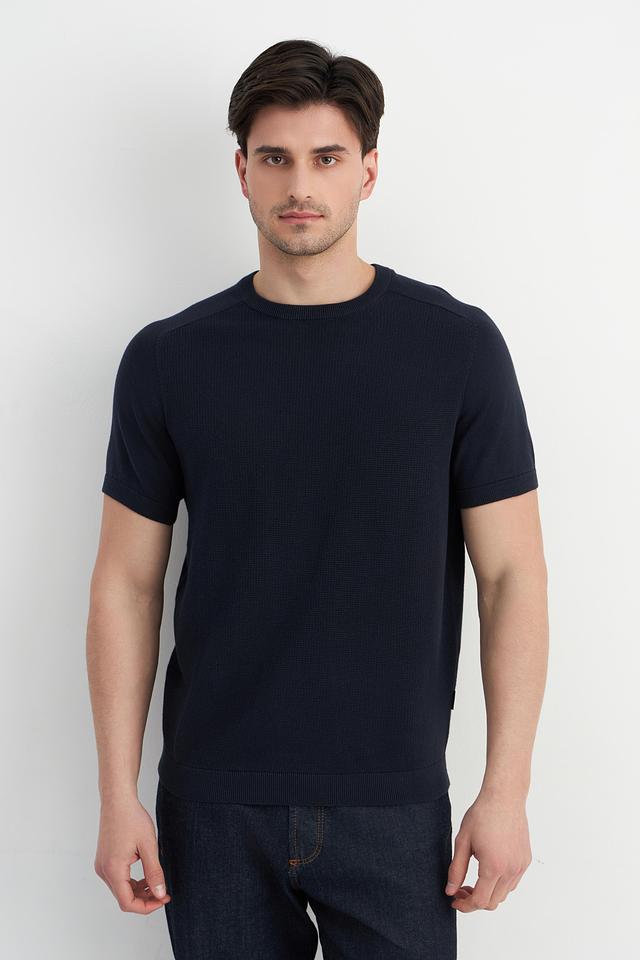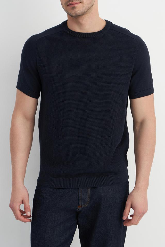 Мужской пуловер Bugatti темно-синего цвета с короткими рукавами и текстурной вязкой. Изготовлен из 100% хлопка, обеспечивая комфорт и воздухопроницаемость. Стильный и универсальный выбор для повседневного гардероба. Состав: хлопок 100%