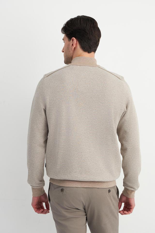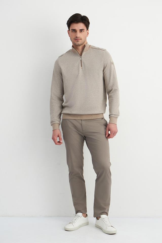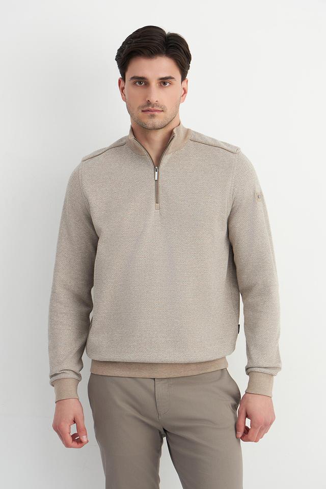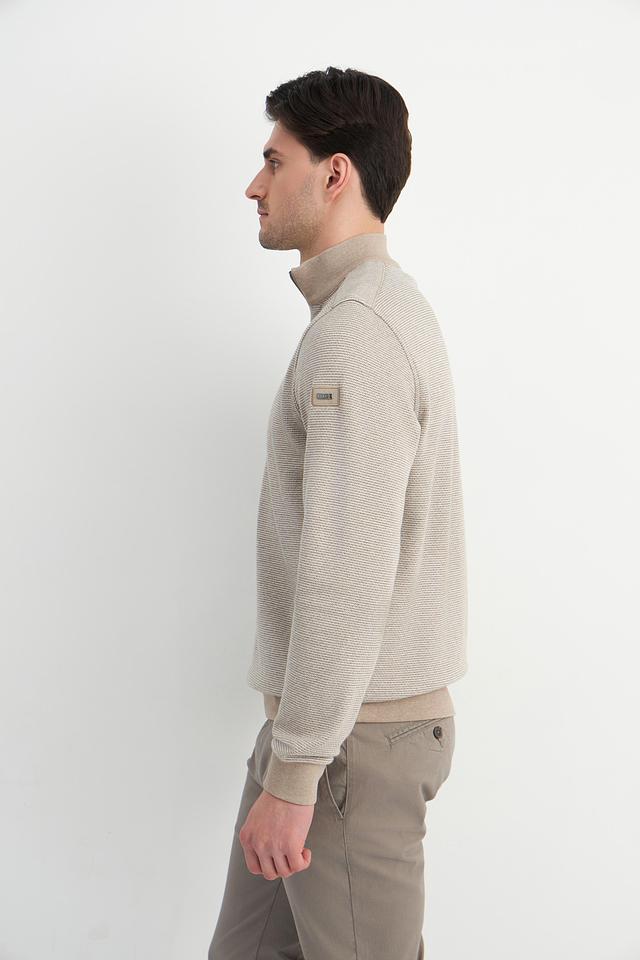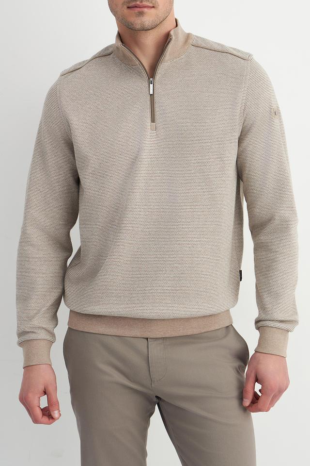 Мужской пуловер Bugatti бежевого цвета с короткой молнией на воротнике. Изготовлен из фактурного трикотажа, имеет манжеты и низ изделия выполнены резинкой. Стильный и комфортный выбор для повседневного гардероба. Состав: хлопок 65%, полиэстер 30%, эластан 5%