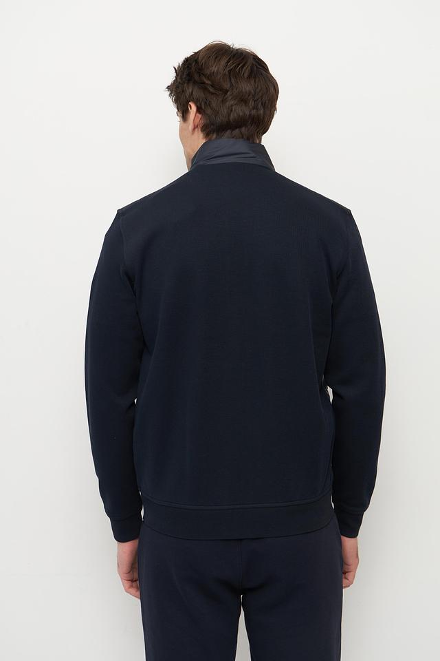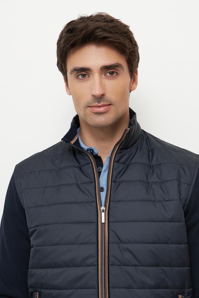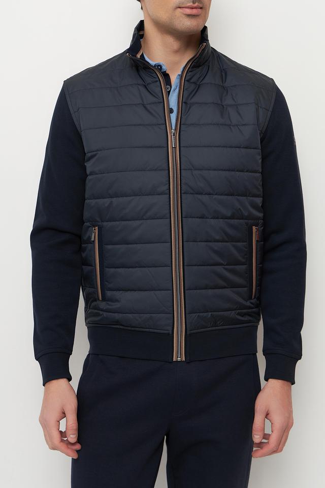 Мужской кардиган Bugatti выполнен в темно-синем цвете и сочетает в себе элементы стеганой куртки и трикотажного кардигана. Передняя часть и верхняя часть спинки выполнены из стеганой ткани, что придает модели современный и динамичный вид.