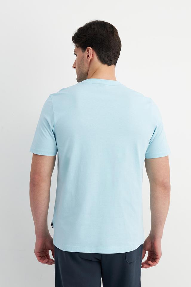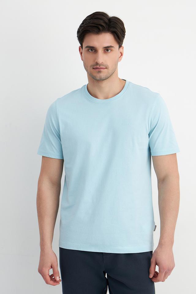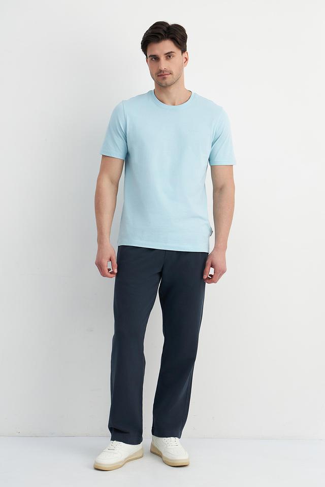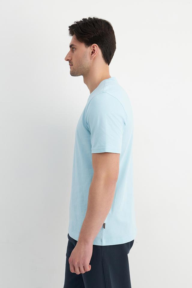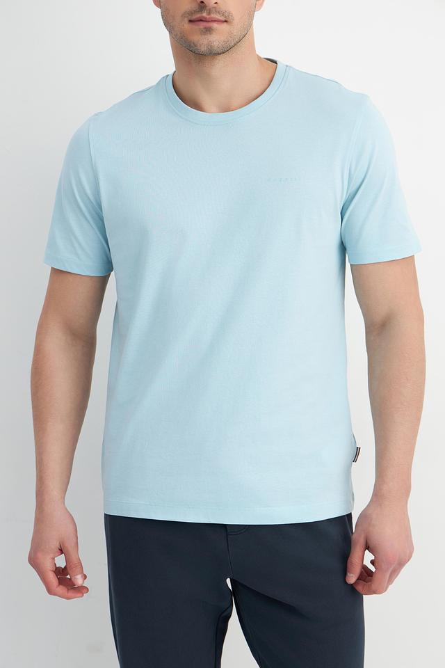 Цвет футболки — нежный голубой, который легко сочетается с другими элементами гардероба. Минималистичный дизайн без каких-либо принтов или логотипов делает эту футболку универсальной и подходящей для различных стилей.