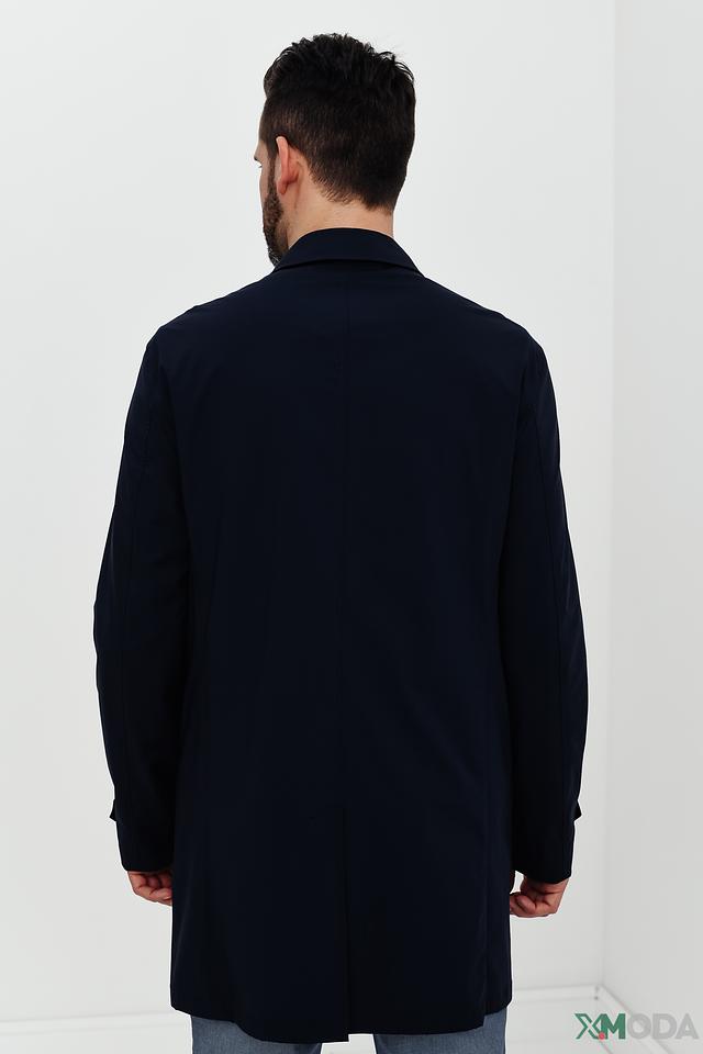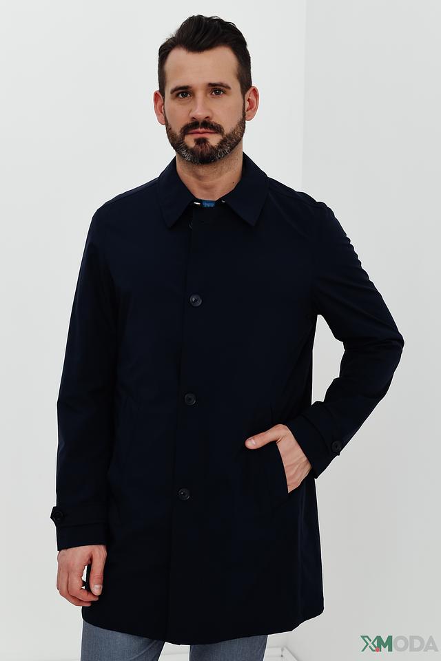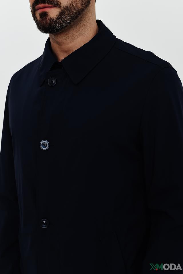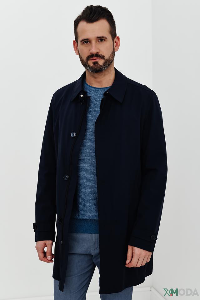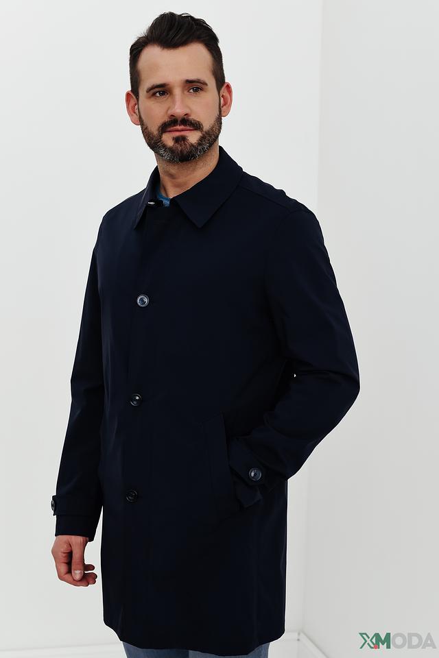 Плащ имеет тёмно-синий цвет, прямой крой и длину до середины бедра. Застёжка на пуговицы обеспечивает надёжную защиту от ветра и дождя. Воротник рубашечного типа добавляет элегантности образу.