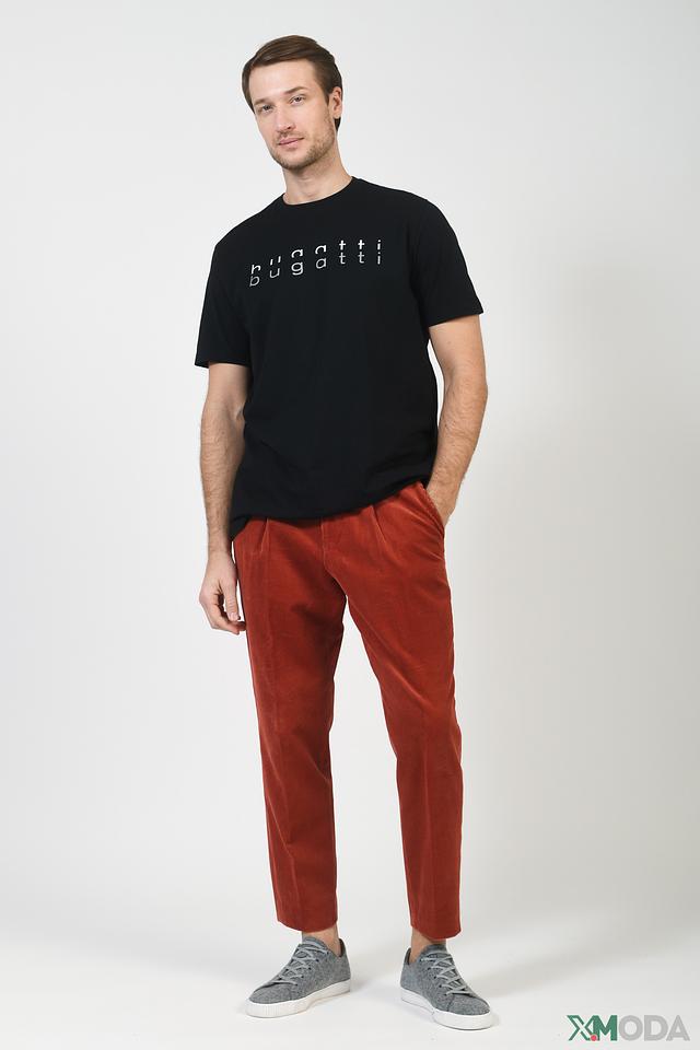 На груди расположена надпись-логотип бренда Bugatti, выполненная белым цветом. Логотип выполнен в виде повторяющегося названия бренда, что придает футболке современный и стильный вид.