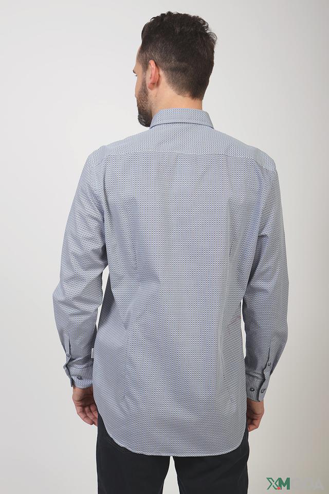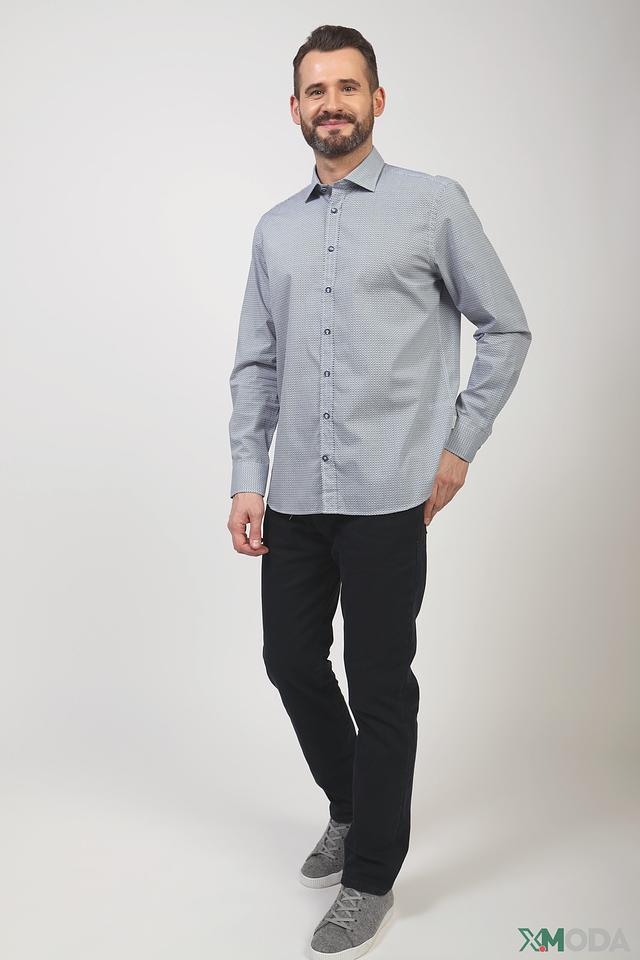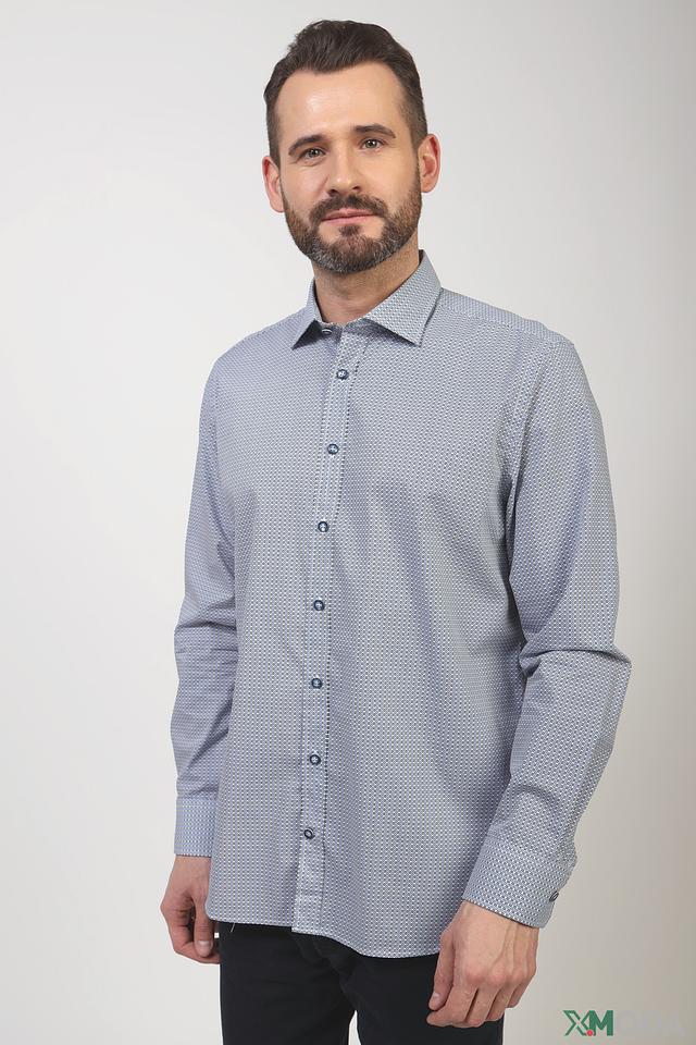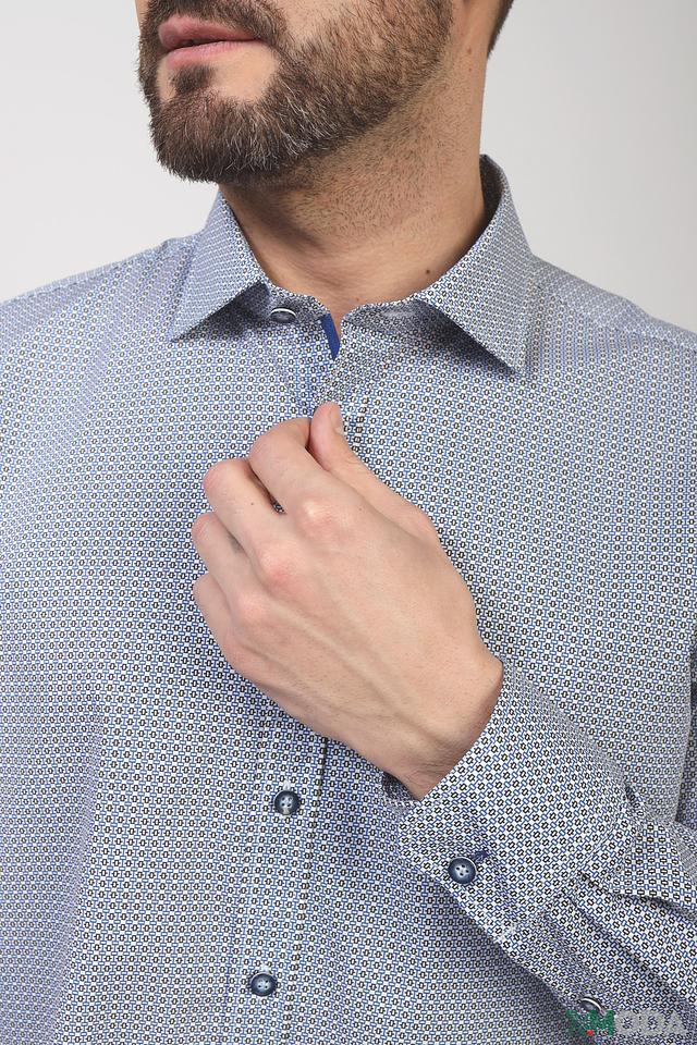 Рубашка имеет классический крой, подходящий для различных случаев – от деловых встреч до повседневной носки. Особенностью модели является оригинальный геометрический рисунок, выполненный в голубых и белых тонах, который придает ей современный и элегантный вид.