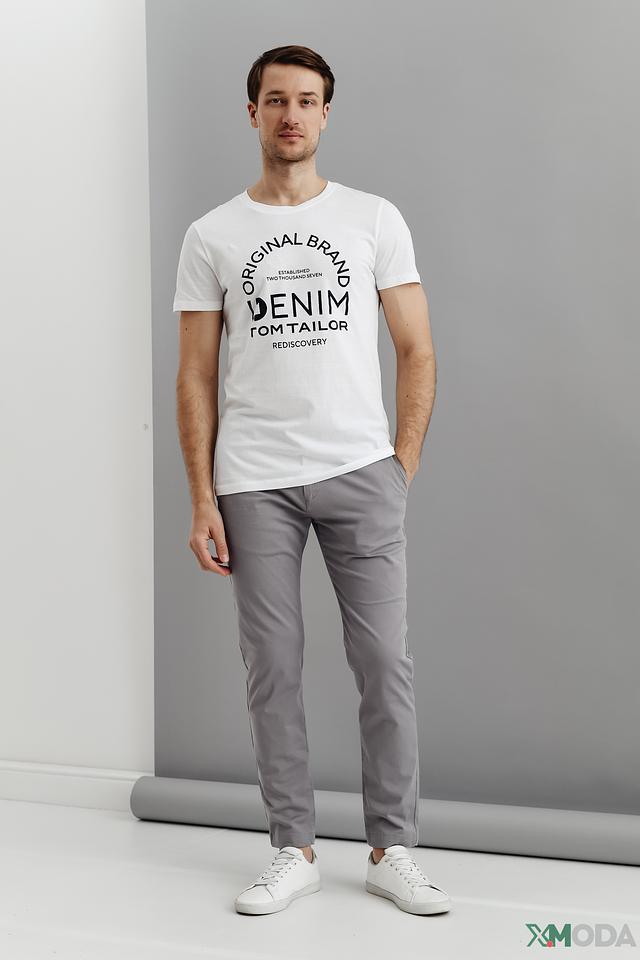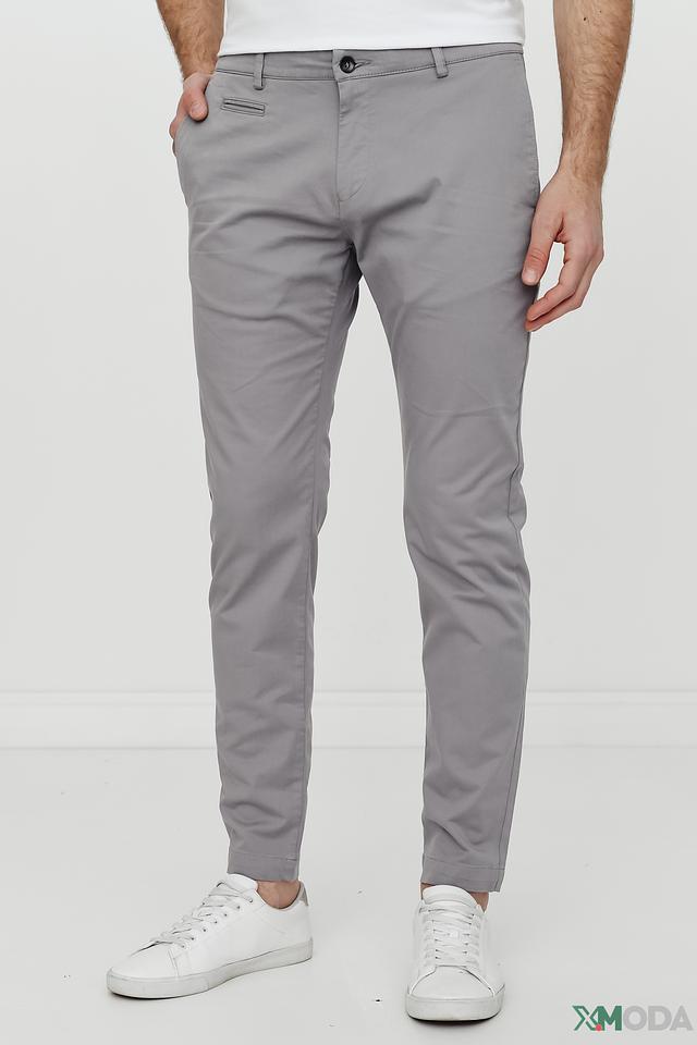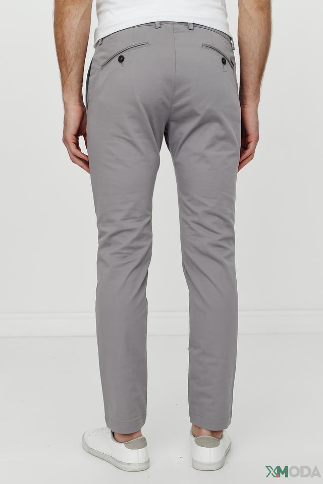 Брюки имеют стандартную посадку, прямой крой и зауженный книзу силуэт. Застежка на молнию и пуговицу обеспечивает надежную фиксацию. На брюках предусмотрены боковые и задние карманы.