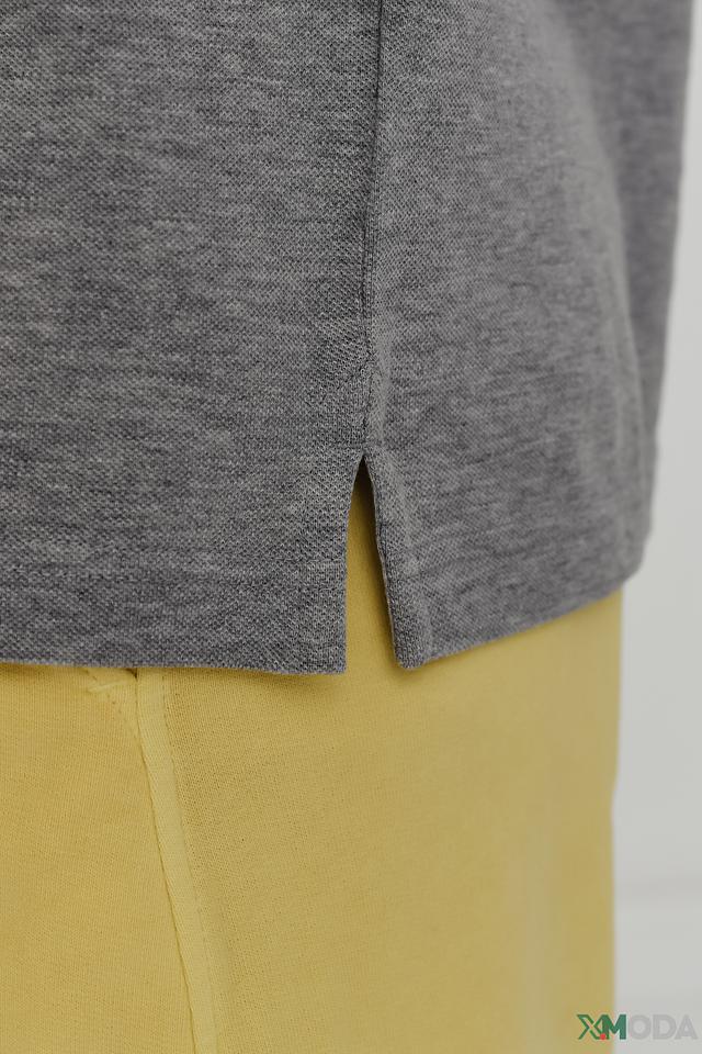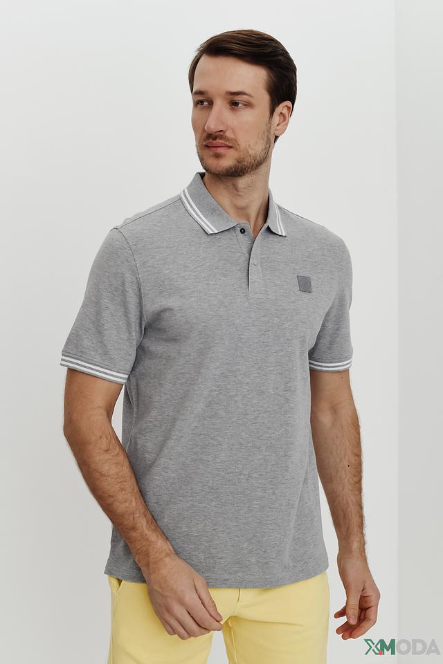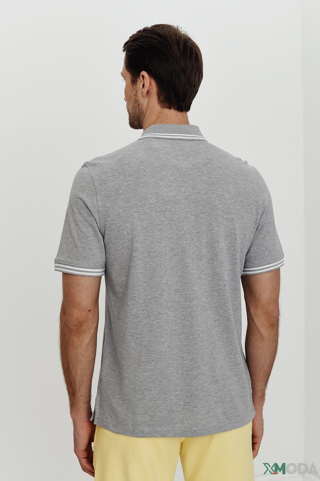 Модель имеет короткие рукава и воротник-поло с контрастной белой и серой полоской. На груди расположена небольшая эмблема бренда. Поло идеально подходит для создания повседневных образов.