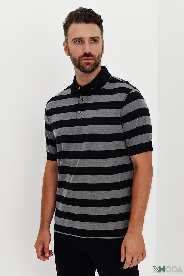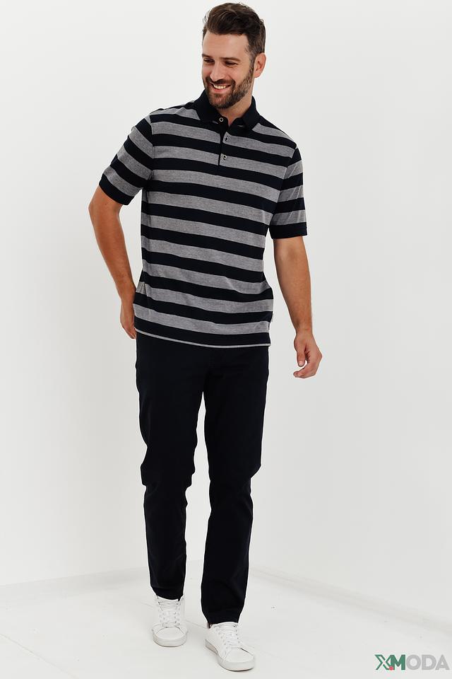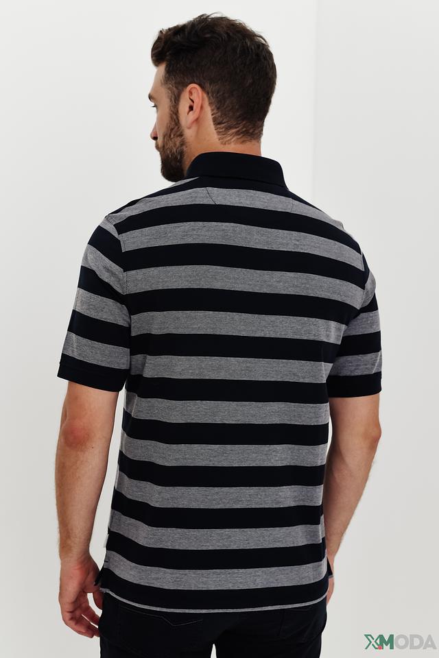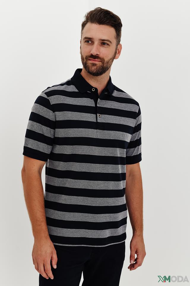 Основной цвет поло – тёмно-синий, дополненный широкими серыми полосами. Такое сочетание делает изделие универсальным и легко сочетаемым с различными элементами одежды.