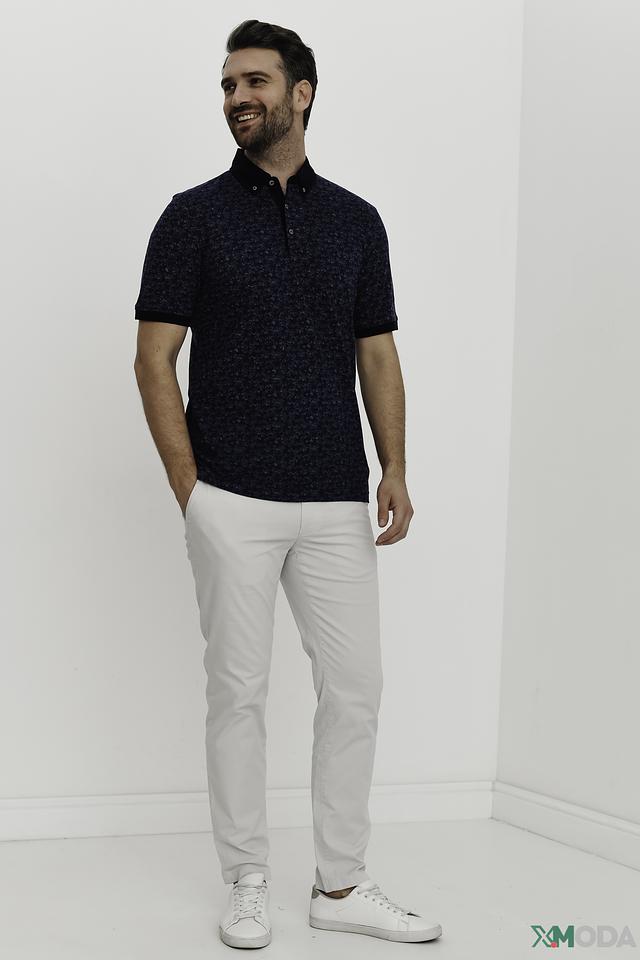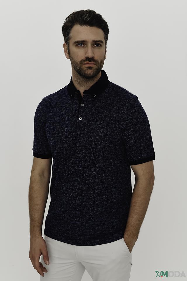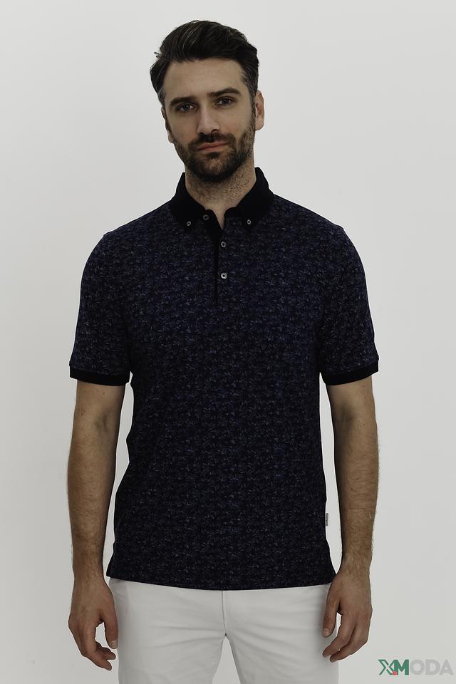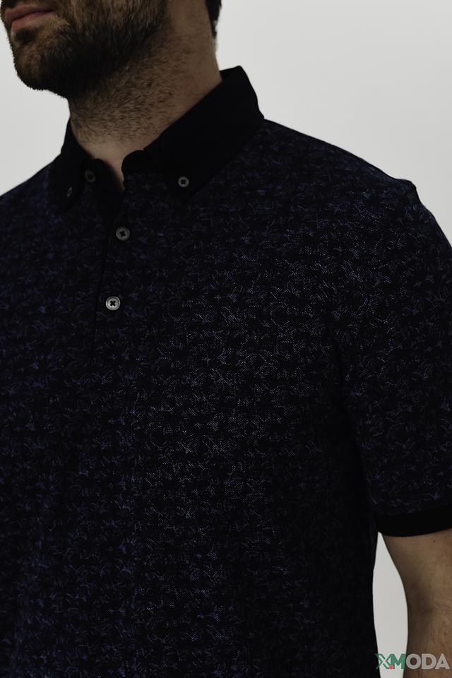Основной цвет поло – насыщенный синий, украшенный оригинальным узором, который придает изделию индивидуальность. Воротник и манжеты выполнены в контрастном черном цвете, что добавляет поло выразительности.