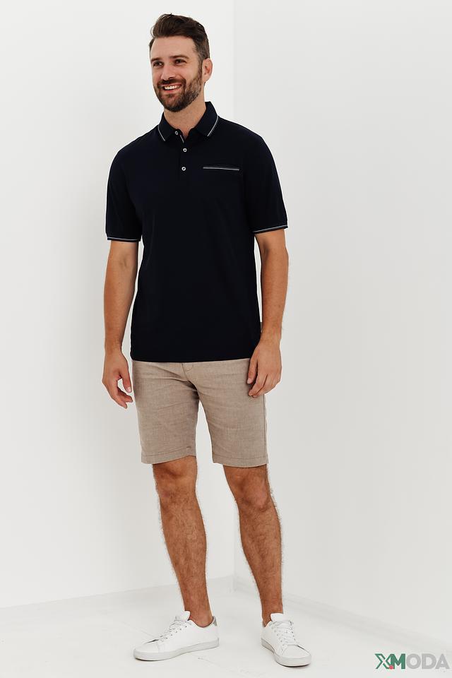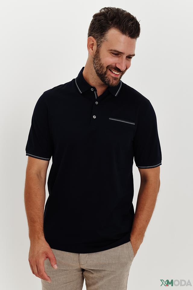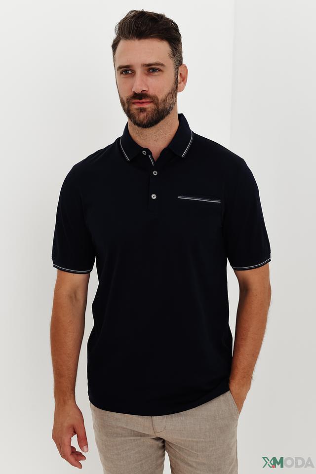 Воротник и рукава поло оформлены аккуратной белой полоской, что добавляет модели элегантности и изысканности. На груди расположена небольшая накладная деталь с аналогичной отделкой. Эта деталь не только украшает поло, но и подчеркивает его современный дизайн.