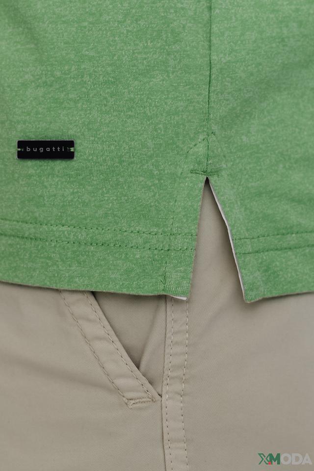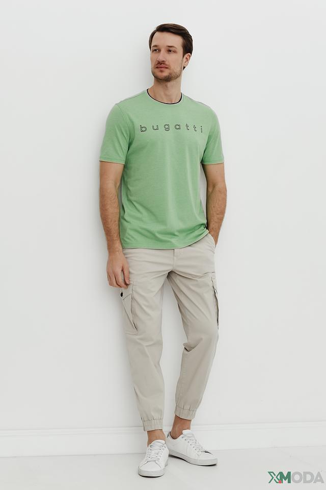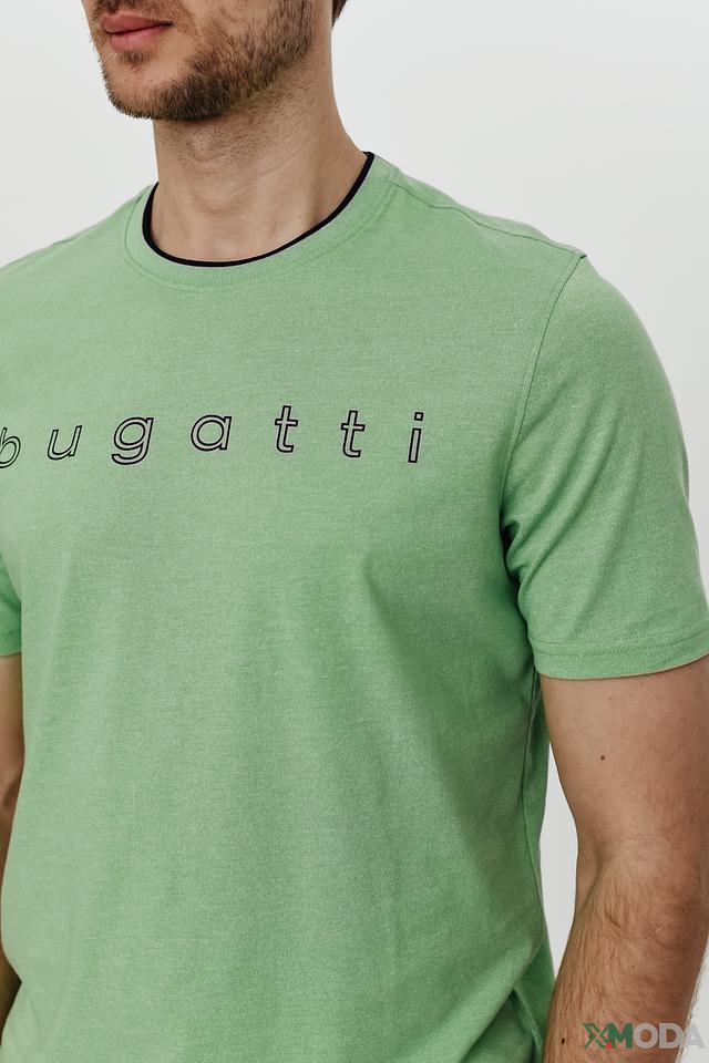 На груди футболки расположен логотип бренда Bugatti, выполненный в тон изделия, что придает ей лаконичный и современный вид. Круглый вырез горловины дополнен тонкой темной окантовкой, добавляющей контраст и завершенность образу.