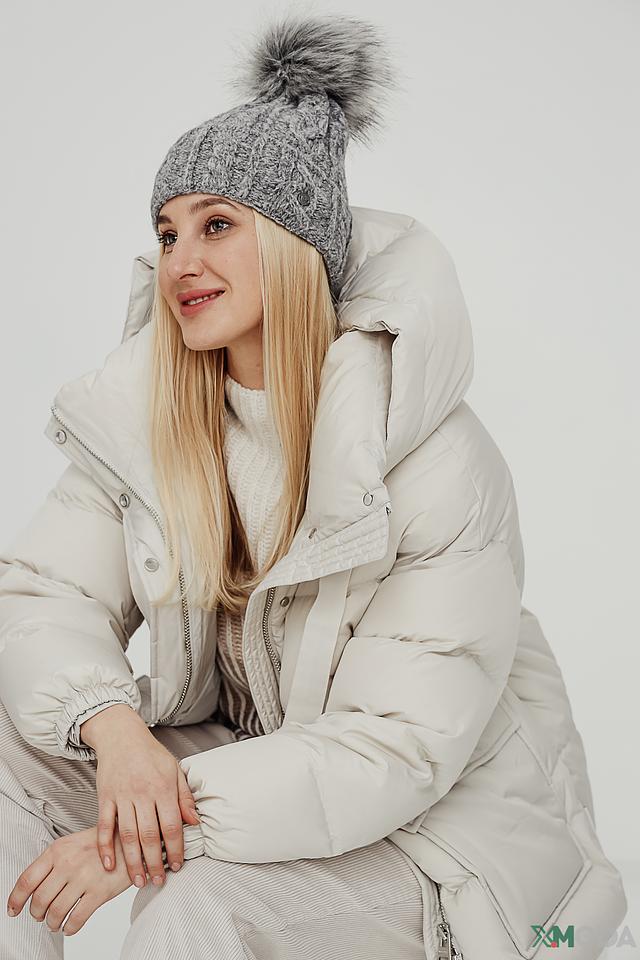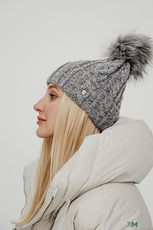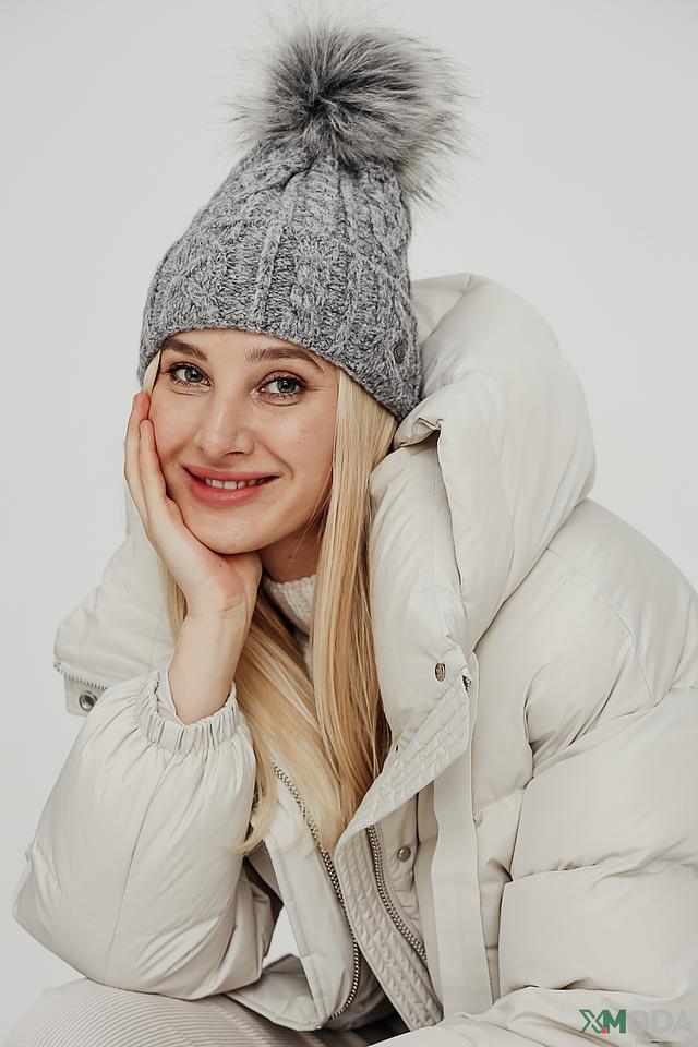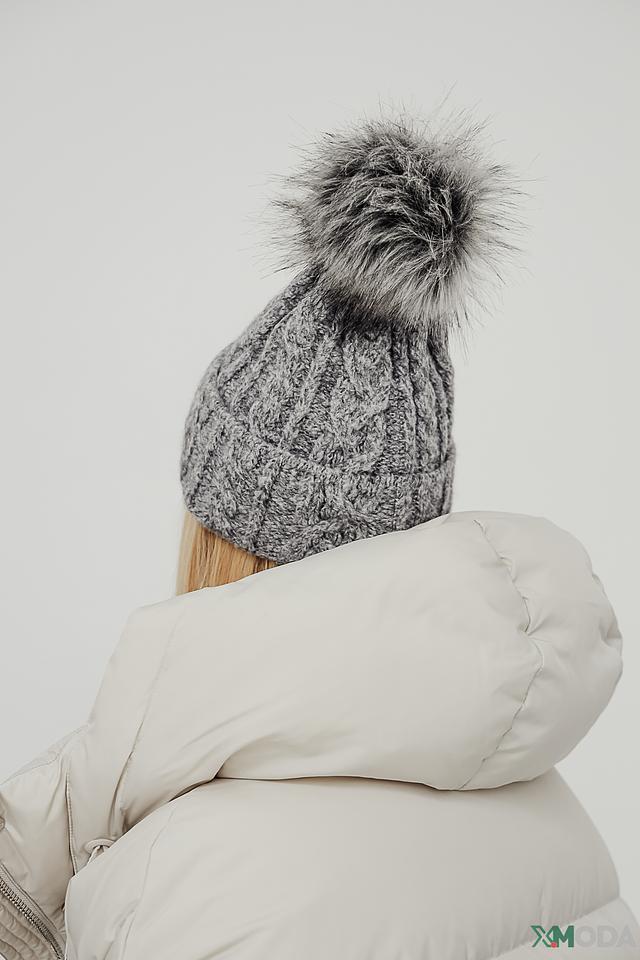 Шапка имеет классический дизайн с крупной вязкой и эффектным меховым помпоном. Серый цвет модели универсален и легко сочетается с различными элементами гардероба.