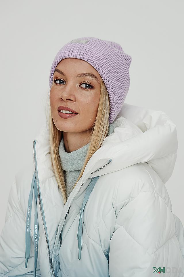 Шапка имеет классическую вязаную текстуру и лавандовый цвет, который легко сочетается с различными образами. Небольшой логотип бренда, аккуратно расположенный на передней части шапки, добавляет ей изысканности.