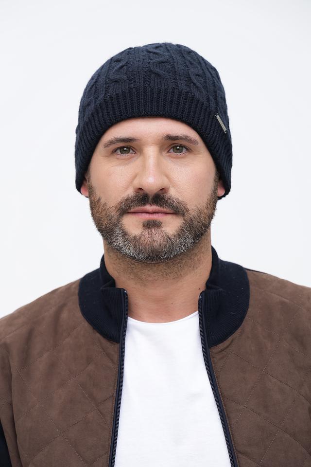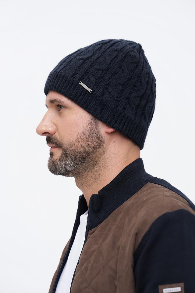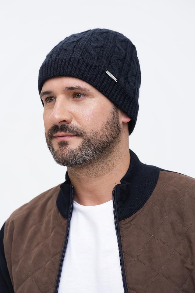 Шапка имеет классический дизайн с выразительным узором "косы", который придает ей стильный и современный вид. Тёмно-синий цвет делает её универсальной и легко сочетаемой с различной одеждой.