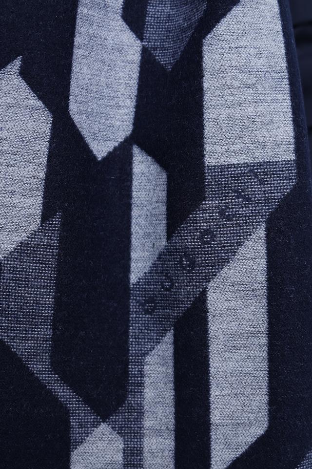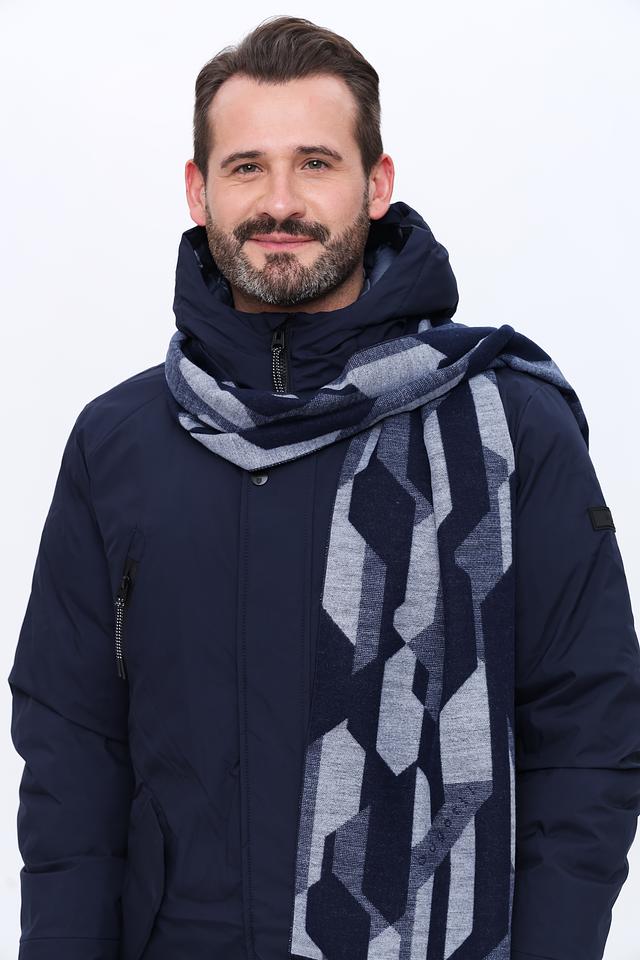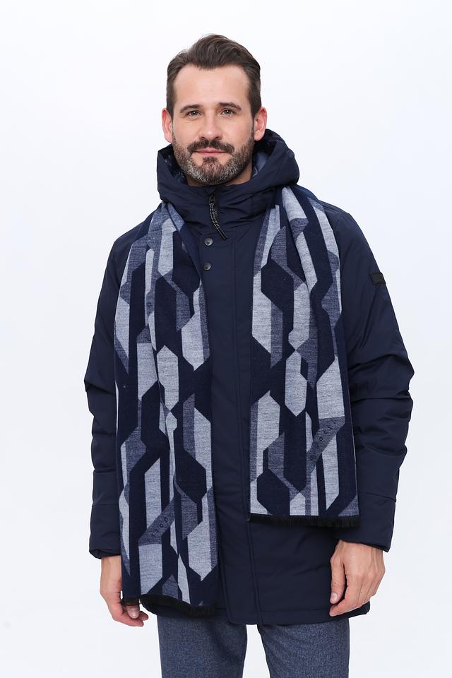 Шарф имеет классический прямоугольный крой и украшен стильным геометрическим рисунком в синих и серых тонах. Такой узор добавит изысканности и индивидуальности вашему образу.