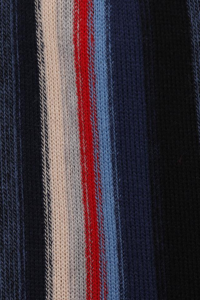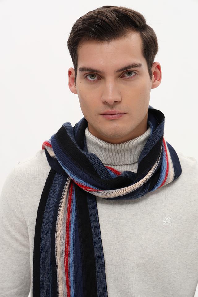 Основной цвет шарфа – тёмно-синий, дополненный полосами красного, белого и светло-голубого цветов. Такое сочетание делает его универсальным и подходящим к различным стилям одежды.
