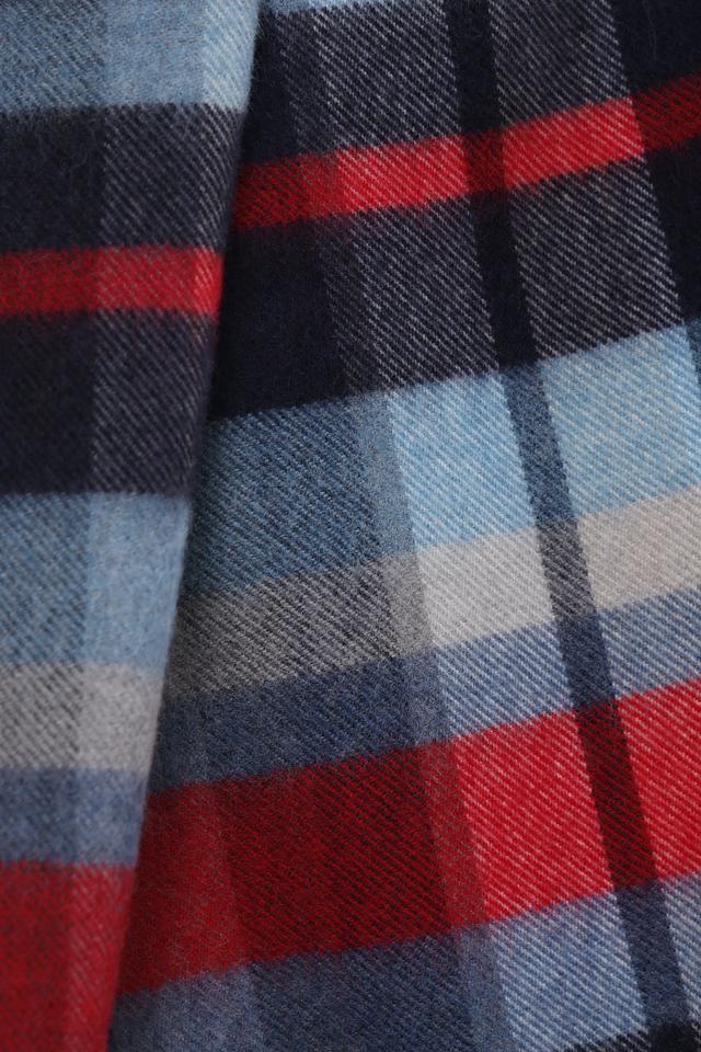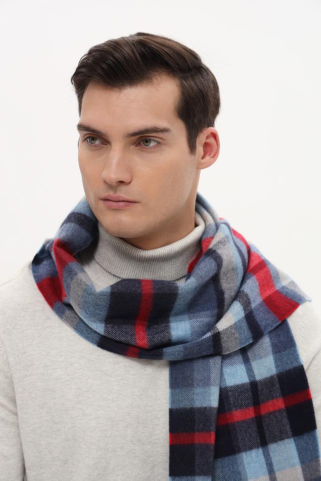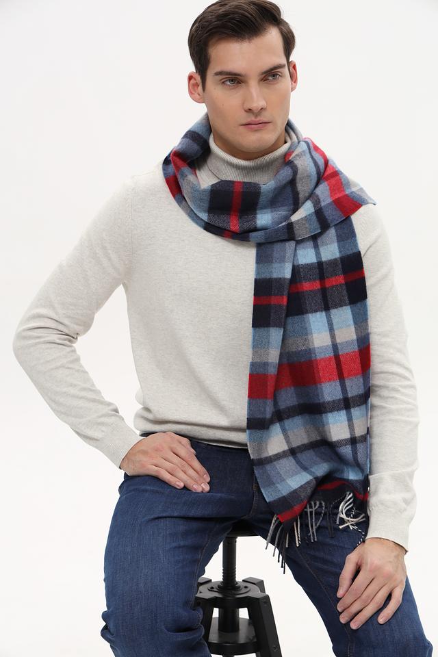 Дизайн шарфа представляет собой классическую клетку, сочетающую в себе оттенки синего, красного и серого. Такая расцветка легко сочетается с различными элементами гардероба, добавляя образу элегантности и изысканности.