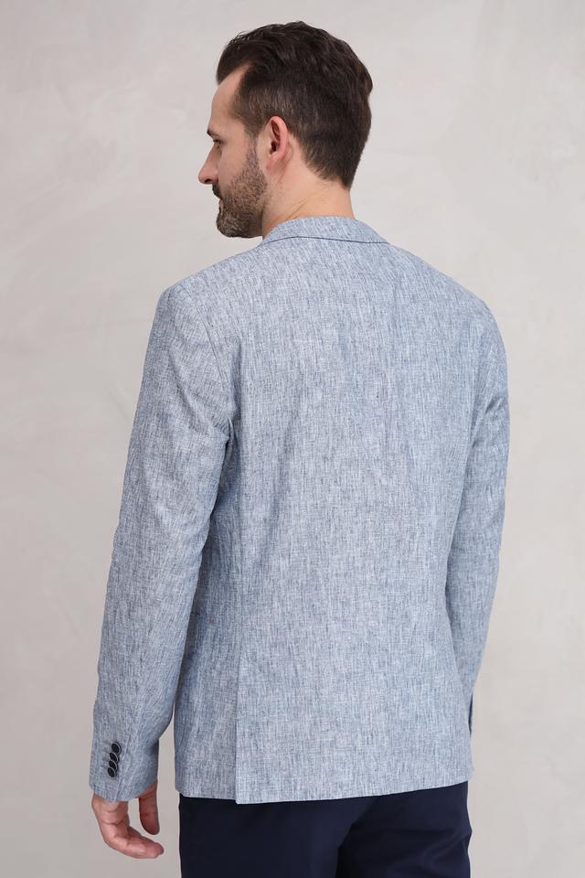 Пиджак имеет классический крой, который подходит для большинства типов фигур. Голубой цвет с текстурой льна придаёт изделию свежий и современный вид. Застёжка на две пуговицы, аккуратный лацкан и функциональные карманы делают этот пиджак практичным и универсальным.