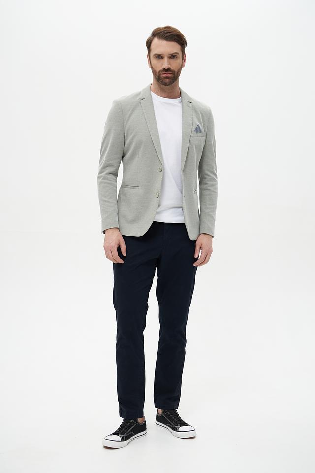 Пиджак застегивается на две пуговицы, имеет классический отложной воротник и прорезные карманы с клапанами. На левом лацкане предусмотрен карман для нагрудного платка.