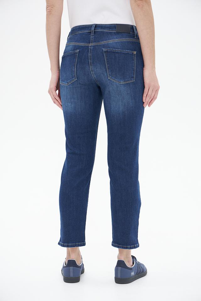 Джинсы имеют прямой крой и слегка зауженный книзу силуэт, который визуально удлиняет ноги. Эффект утяжки в области живота и бёдер обеспечивает комфортную посадку и подчёркивает достоинства фигуры. Ткань состоит из 92% хлопка, 6% эластомультиэстера и 2% эластана, что гарантирует мягкость, эластичность и долговечность изделия.
