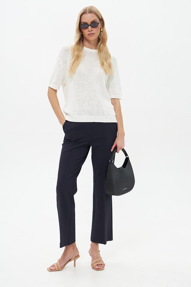 Брюки имеют классический крой с завышенной талией и широкими штанинами, что визуально удлиняет ноги и создает элегантный силуэт. Наличие стрелок добавляет строгости и делового стиля. Застежка на молнию и пуговицу обеспечивает надежную фиксацию.